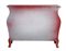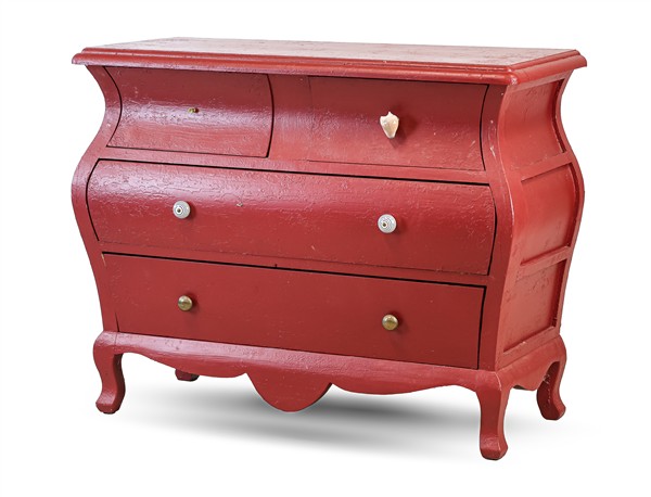 Comò di forma mossa in legno verniciato rosso a quattro cassetti di cui due all