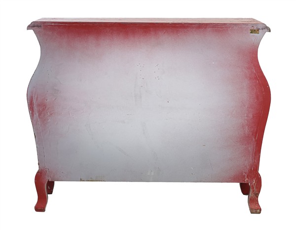 Comò di forma mossa in legno verniciato rosso a quattro cassetti di cui due allineati sottopiano (cm 108x87x48) (difetti e mancanze)