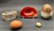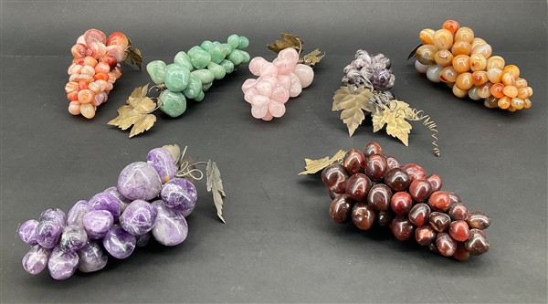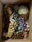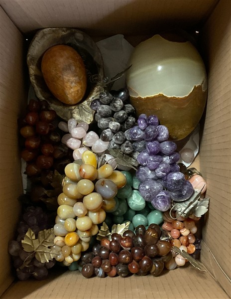 Cartone contenente diversi oggetti in pietra dura di misure e decori diversi, tra cui numerosi frutti (difetti)