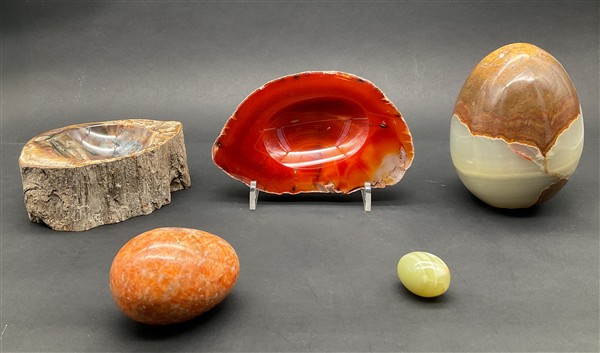 Cartone contenente diversi oggetti in pietra dura di misure e decori diversi, t