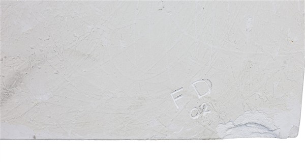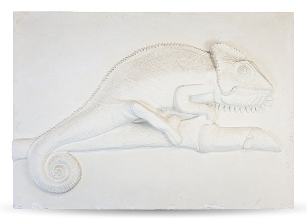 Ignoto, grande pannello decorativo in gesso raffigurante in altorilievo un camaleonte (cm 124x176x12) siglato F.D. e datato 02 in basso a destra