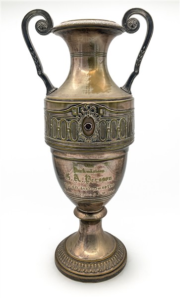 Grande vaso trofeo biansato in metallo argentato con fronte decorato a placca a smalti policromi con monogramma in oro e dedica incisa datata "1928" (h cm 67) (difetti)