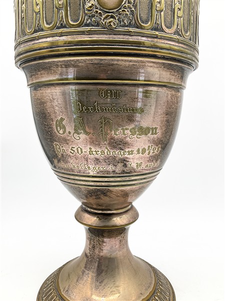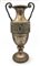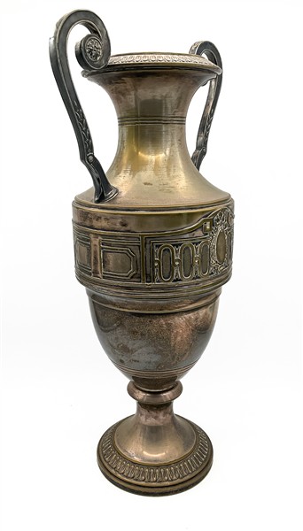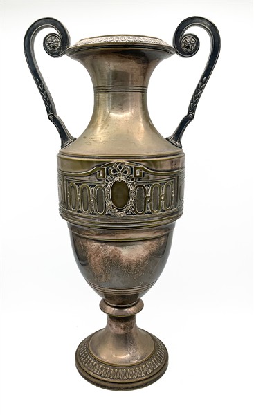Grande vaso trofeo biansato in metallo argentato con fronte decorato a placca a
