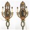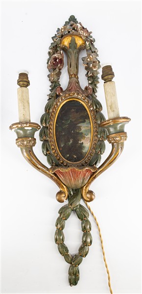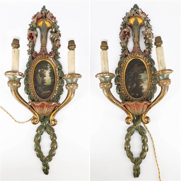 Coppia di applique a due fiamme in legno intagliato, dipinto e laccato in policromia a fiori e volute centrate da dipinti raffiguranti paesaggi (h cm 70) (difetti)