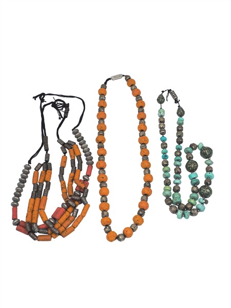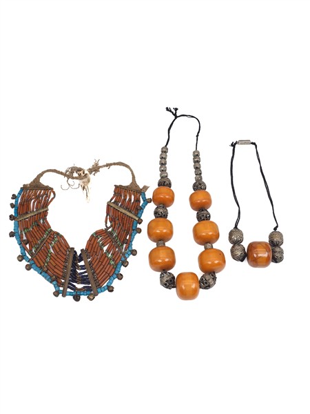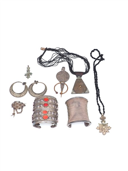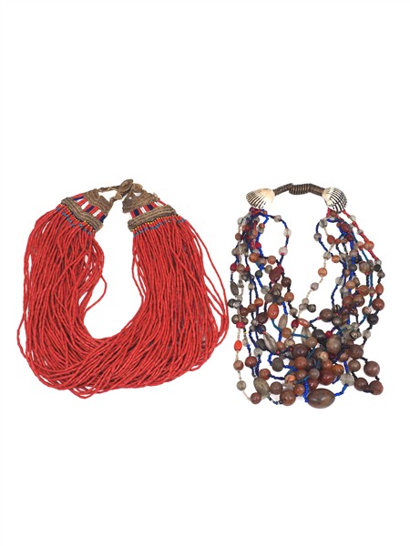 Silver, metal, copper, hard stone and various imitation and glass paste African style lot comprising thirteen necklaces, two bangle bracelets, fibula, brooch, in all gross g 3888 circa. (defects and losses)