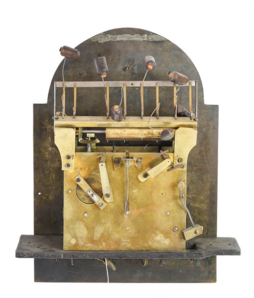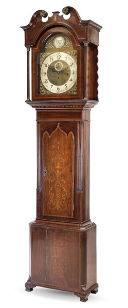 Orologio cassalunga con cassa in mogano intarsiata e filettata in legni vari a volute e motivi geometrici. Quadrante a numeri arabi in rilievo, movimento a tre treni con suoneria del tipo Westminster su campane tubolari. Inghilterra, seconda metà del secolo XIX (h. cm 231) (difetti e rotture)