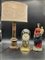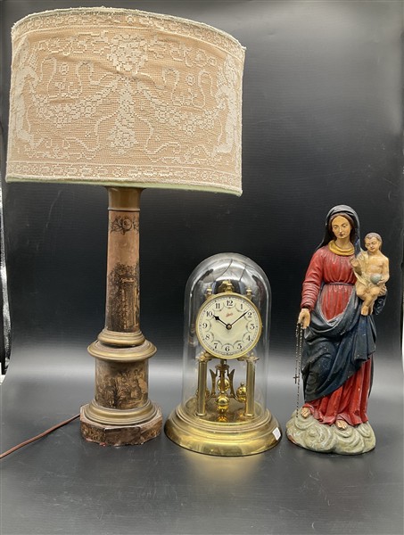 Lotto composto da una pendola, una Madonna con Bambino in terracotta dipinta in policromia ed una abat-jour in latta con paralume (h max cm 62) (difetti e mancanze)