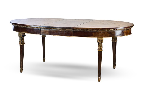 Tavolo ovale allungabile in noce con gambe a obelisco rovesciato decorate all'attacco da intagli con capitelli ionici e foglie di acanto, puntali a motivi fogliacei, piano sotteso da fascia intagliata ad ovuli (chiuso cm 150x76x101, con una prolunga originale L tot. cm 200) (difetti e piccole mancanze)