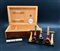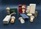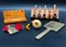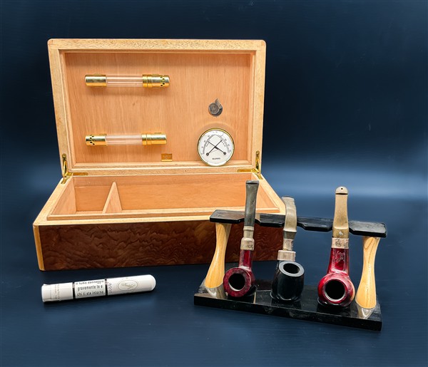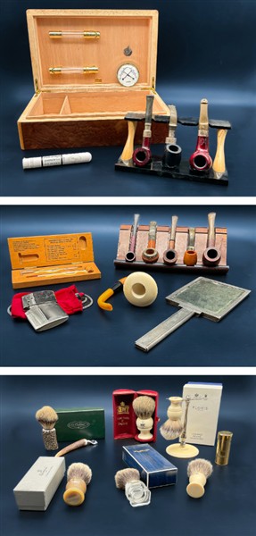 Cartone contenente numerose pipe, attrezzi per rasatura in custodie e accendini