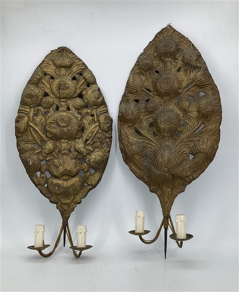 Coppia di fregi a palma in metallo sbalzato e traforato a fiori. Secolo XIX. Montati ad applique a due fiamme (h cm max 68)(difetti)