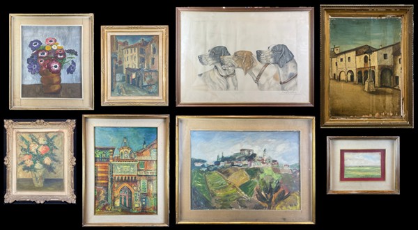 Lotto composto da sei dipinti ad olio, un acquerello e un'incisione di diversi autori, soggetti e misure (cm max 50x70)