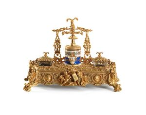 CALAMAIO Importante calamaio in bronzo dorato e cesellato recante stemma...