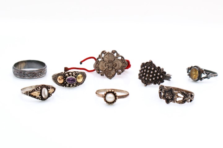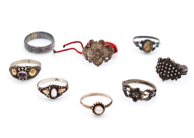 Lotto di otto anelli in metalli, gemme e manifatture varie