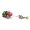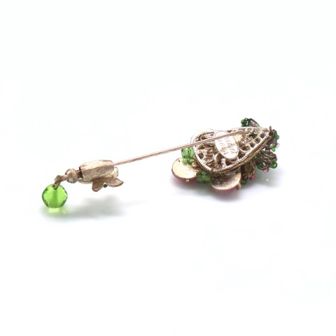 In metallo argentato con cabochon dai colori verde rosa, micro perline colorate e strass.