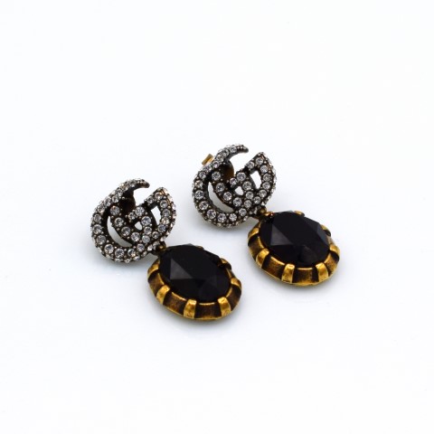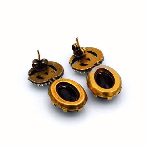 In metallo anticato color oro, con Doppia G, adornate di cristalli e pendenti di cristallo nero sfaccettato.