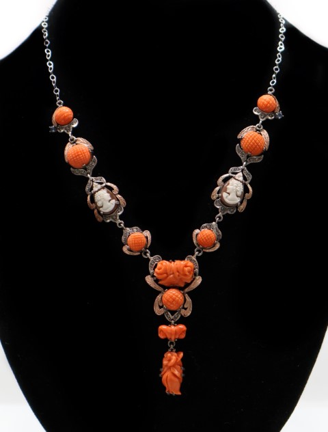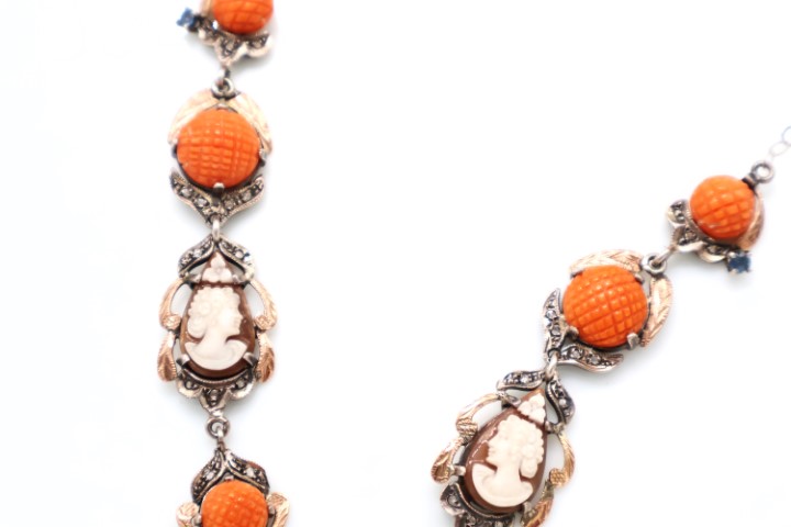 Con due zaffiri, rosette di diamanti, camei in conchiglia e corallo.