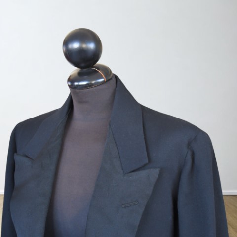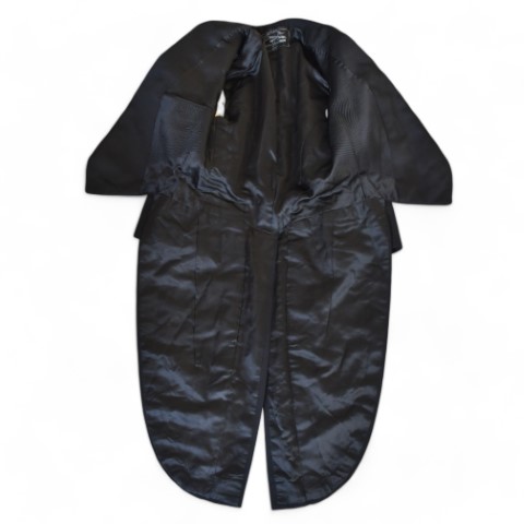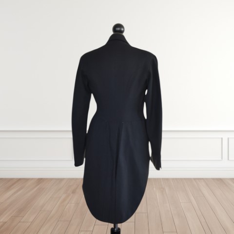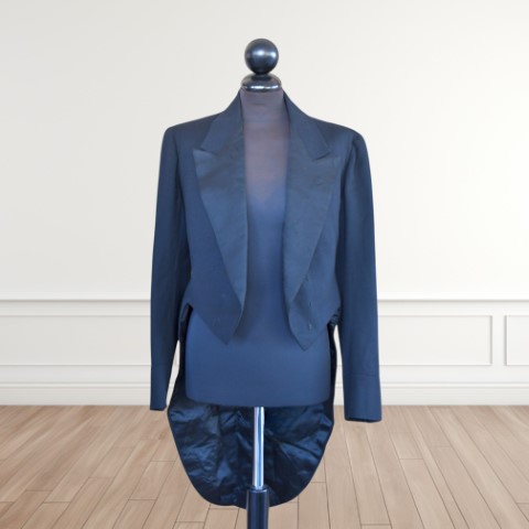 in panno di lana, modello da sera, elegante, aderente, corta sul davanti e a coda di rondine sul retro, bottoni in seta e fodera lavorata in seta.