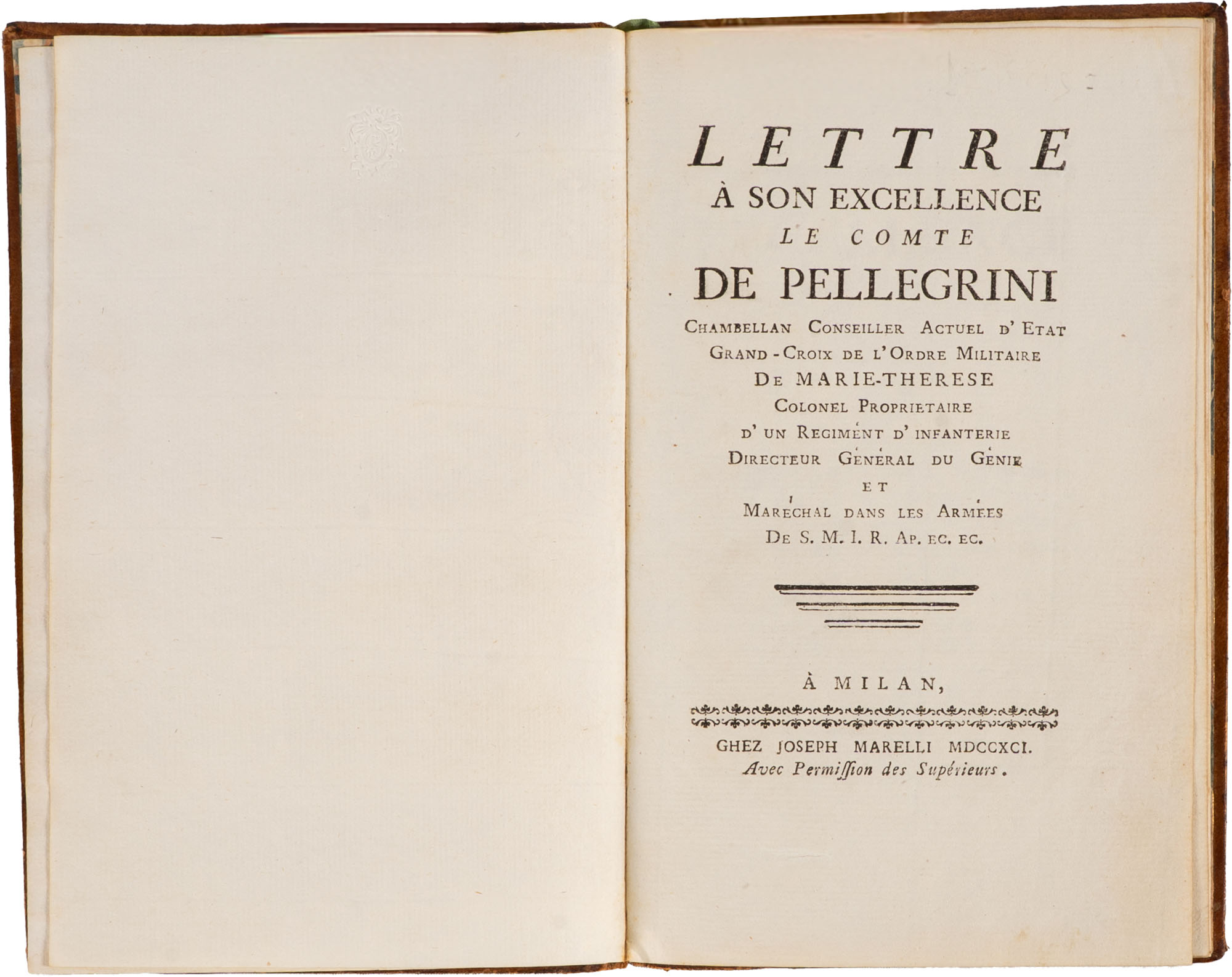 Lettre à son excellence le comte De Pellegrini, Chambellan Conseiller Colonel proprietaire d'un regiment d'infanterie, Directeur Generale du GenieMilano, Joseph Marelli, 1791Bella legatura in piena pelle con decori e tagli in oroPag. 14Cm. 20,5 x 12Condizioni ottime