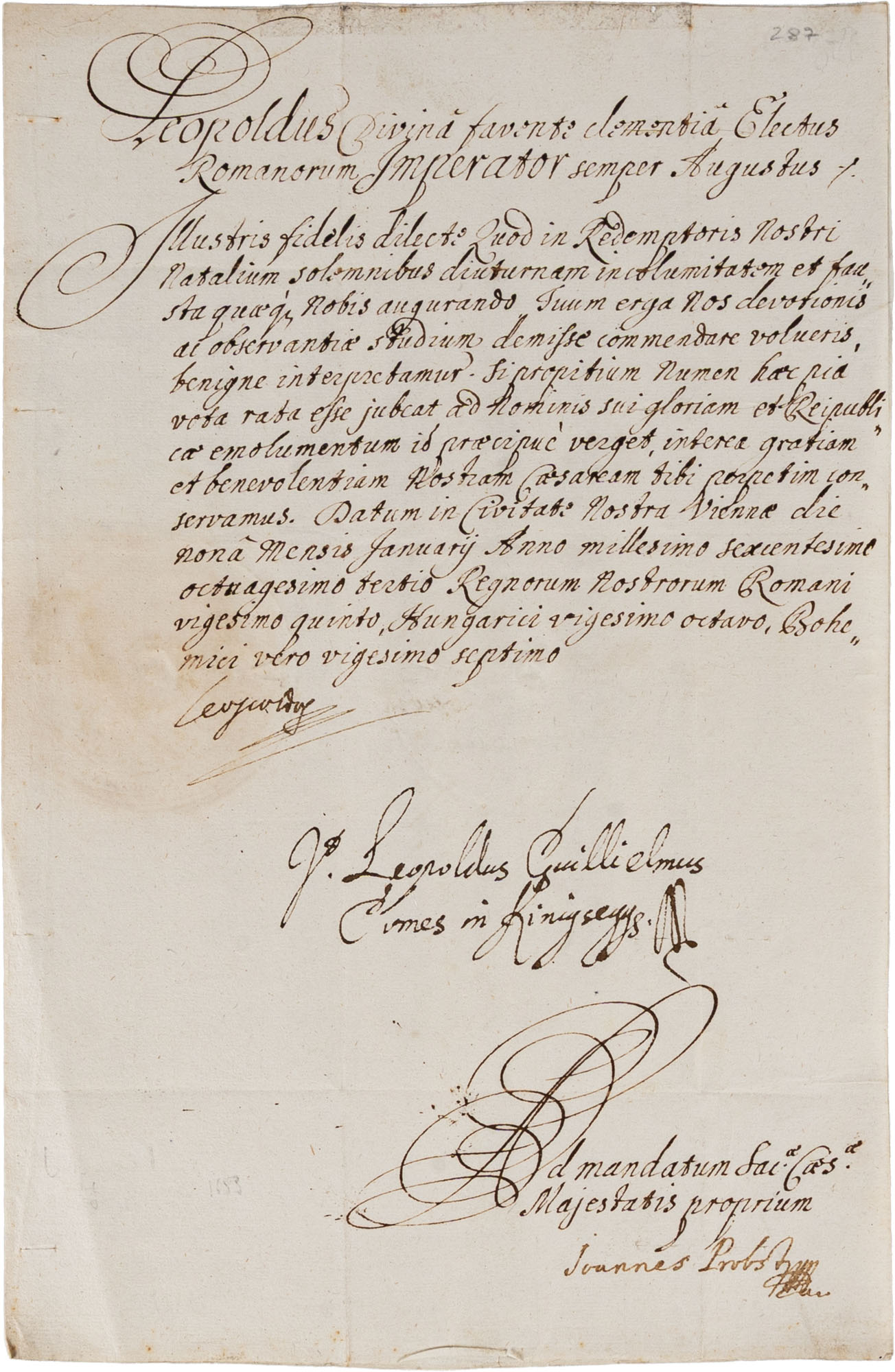 Leopoldo d'Asburgo, imperatore - Missiva scritta da altra mano e firmata di pugno dall'imperatore1683Cm. 20 x 31Condizioni ottime