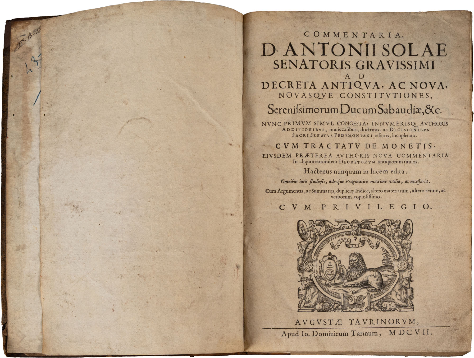 Sola Antonio - Commentaria D. Antonii Solae senatoris gravissimi ad decreta, antiqua, novasque costitutiones serenissimorum ducum Sabaudiae...1607Legatura coeva piena pergamena con titolo in oro al dorsoFrontespizio con marca tipografica incisa; capilettera, testatine e finalini incisi ornati e figuratiPp. (84), 767, (1)In folio antico (Cm. 34 x 24)Le ultime 4 pp. contengono la 'Tavola de' giorni feriati, ne' quali l'Eccellentiss. Senato, & l'Illustrissima Camera de' Contidi di quà [sic] da Monti non sedeno. Riformata per le ferie delle Vendemie, con la Tariffa del valor dello Scudo d'oro dall'anno 1400, in fino al 1607, & del valor del Ducato, & d'alcune monete antiche, & de' paesi d'alcune d'esse' (si tratta del citato 'Tractatus de Monetis' )E' presente un errore tipografico di numerazione, in particolare sono assenti le pp. 357-368 e 621-624, ma il volume è assolutamente completoEsemplare in condizioni generali molto buone con qualche traccia d'uso e qualche glossa e sottolineatura marginale antica a penna