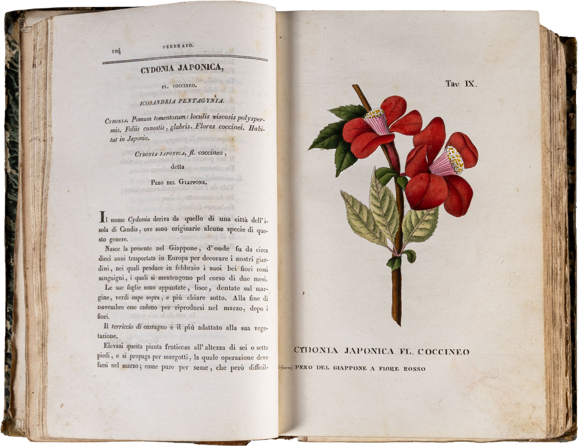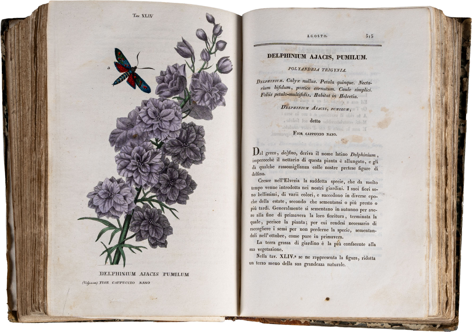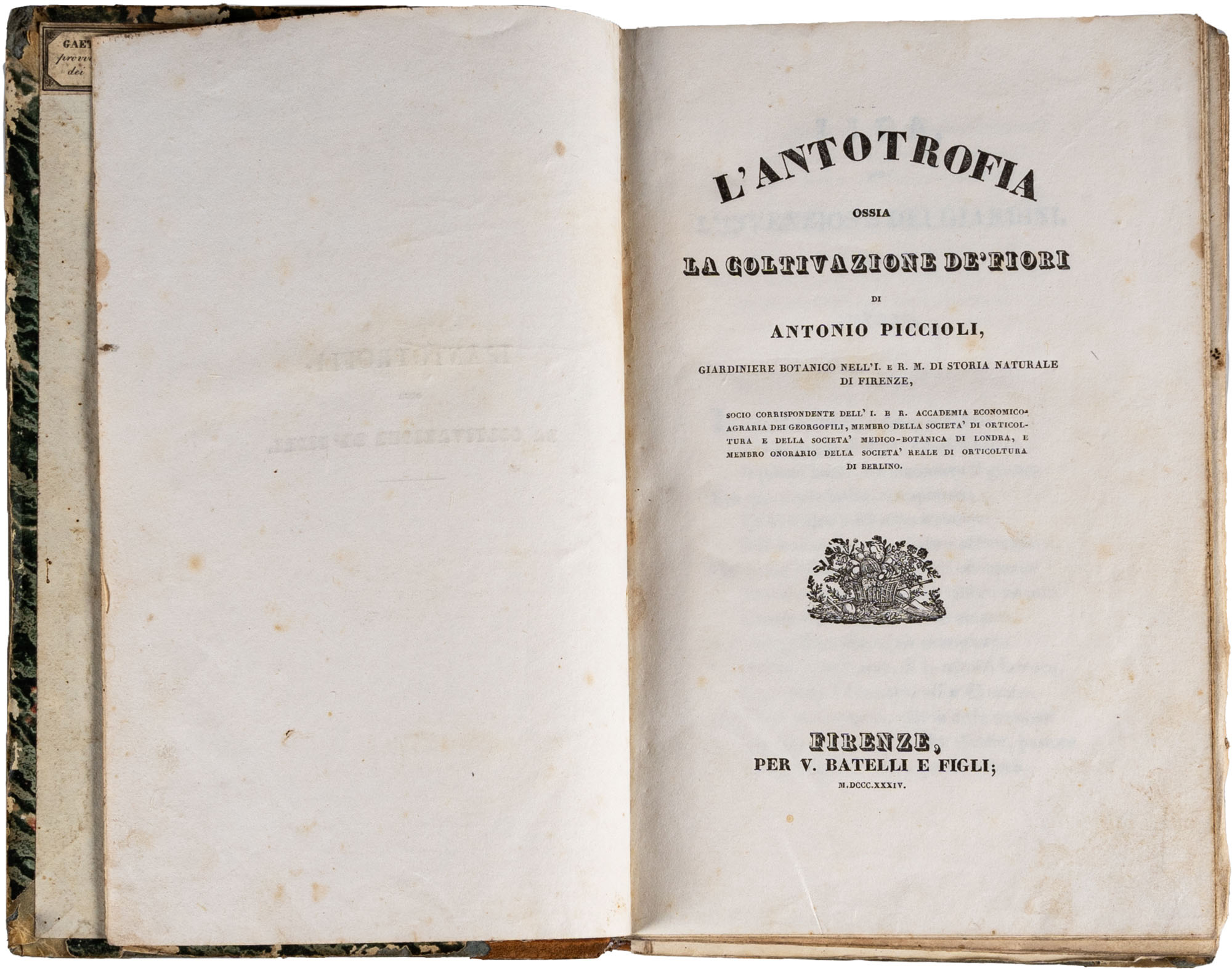 Piccioli Antonio - L'antotrofia ossia la coltivazione de' fioriFirenze, V. Batelli e Figli, 1834Legatura in mezza pelle coeva, titolo e fregi oro al dorso. Opera riccamente illustrata da 72 tavole a coloriPp. 798In-8 p. (mm. 223 x 140)Segni d'uso e strappi al dorso, abrasioni ai piatti, peraltro testo e illustrazioni in buono stato di conservazione