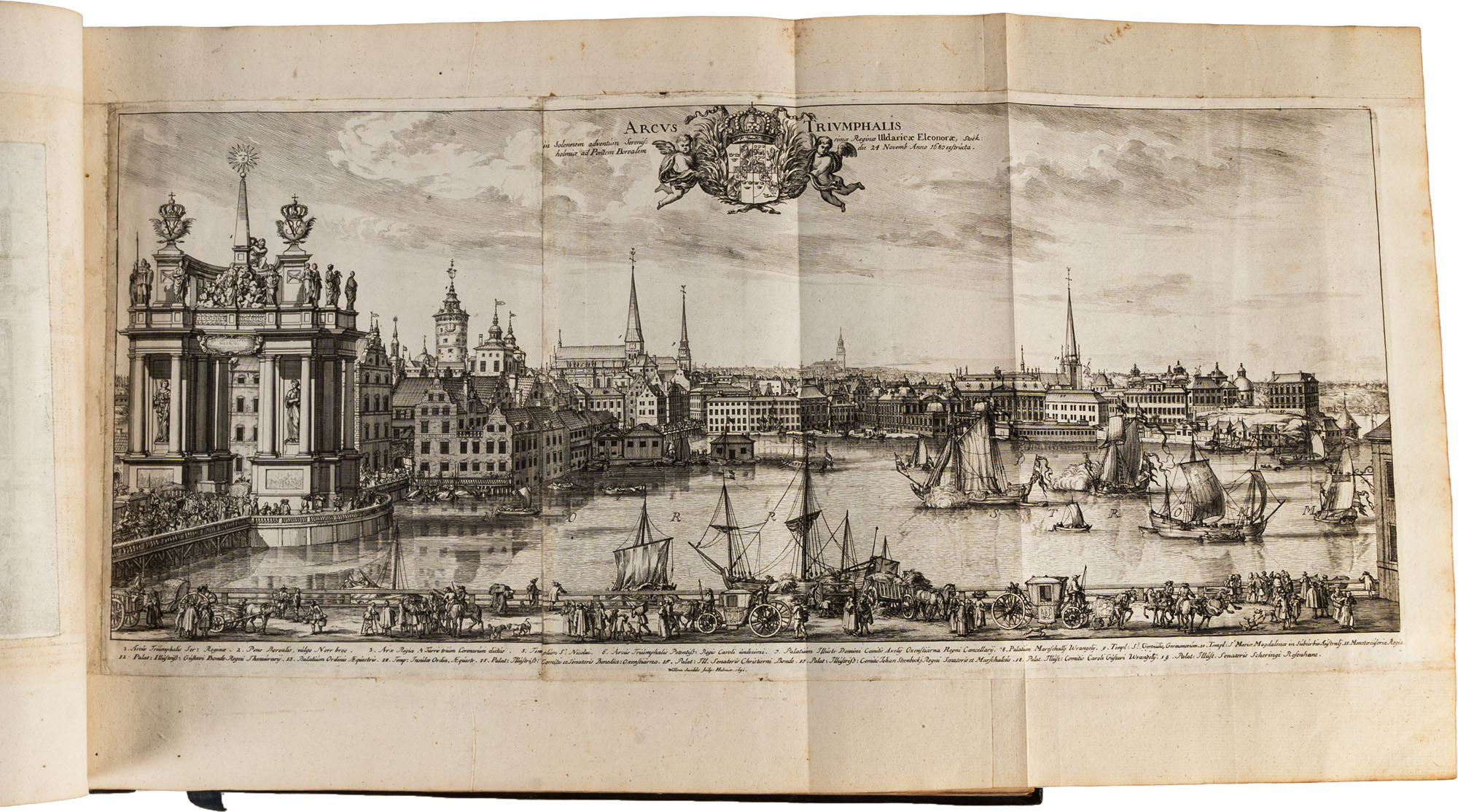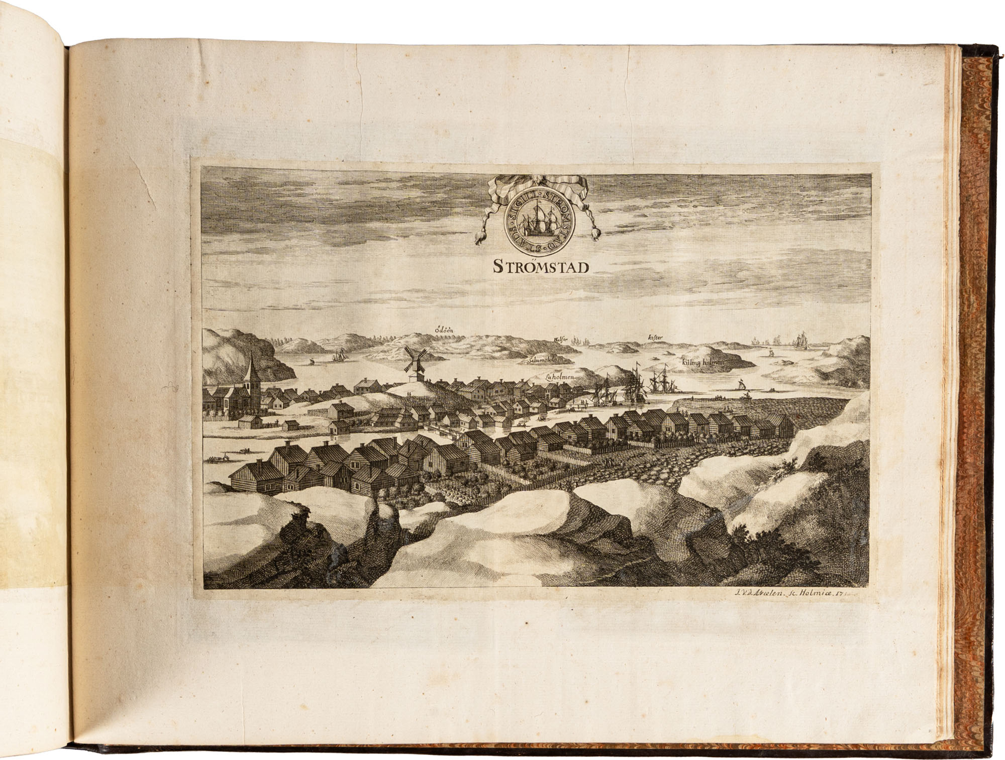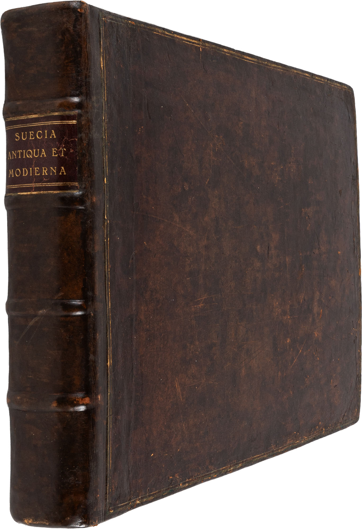 Dahlbergh Erik Johnsson - Suecia antiqua et hodiernaStoccolma, 1693-17143 volumi in un tomoLegatura in piena pelle, filetti ai piatti e titolo in oro al dorso Più di 300 incisioni + 13 pp. di indiceIn folio piccolo oblungoApre la raccolta un'antiporta allegorica a mo' di frontespizio, incisa su rame e applicata alla carta; seguono i ritratti in ovale di Carlo XI e Carlo XII di Svezia, infine di Erik Dahlberg anch'essi applicati alle carteLa raccolta di tavole si apre con due carte geografiche della penisola scandinava, con Danimarca, Lituania e Moscovia a piena pagina, seguono diverse tavole di dimensioni minori con insegne reali e ritratti; ha quindi inizio la serie di vedute di città, in diverse dimensioni su mezza, piena pagina e ripiegate: l'esemplare presenta un montaggio complesso, con incisioni a mezza pagina applicate alle carte, rinforzi al verso di alcune tavole ripiegateCondizioni molto buone