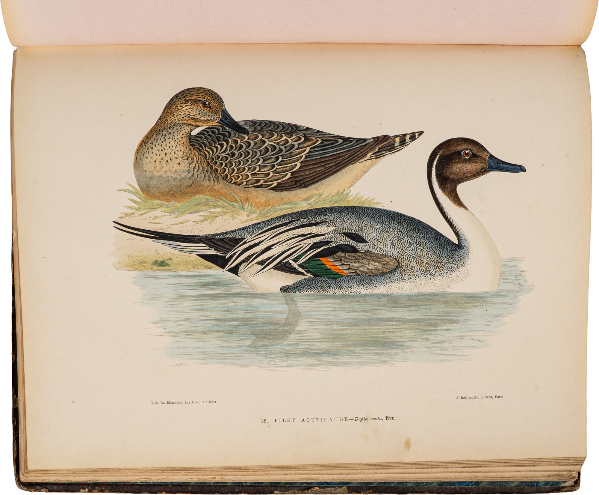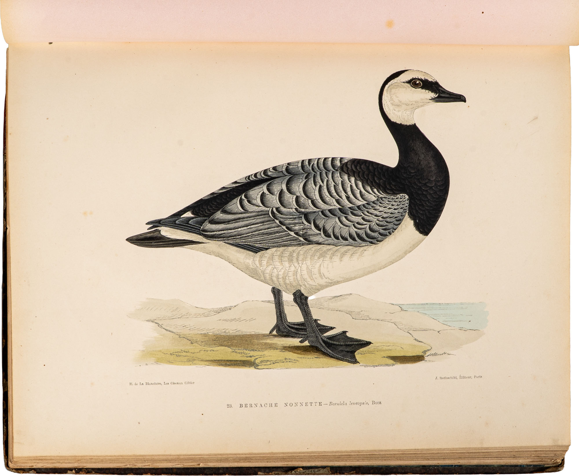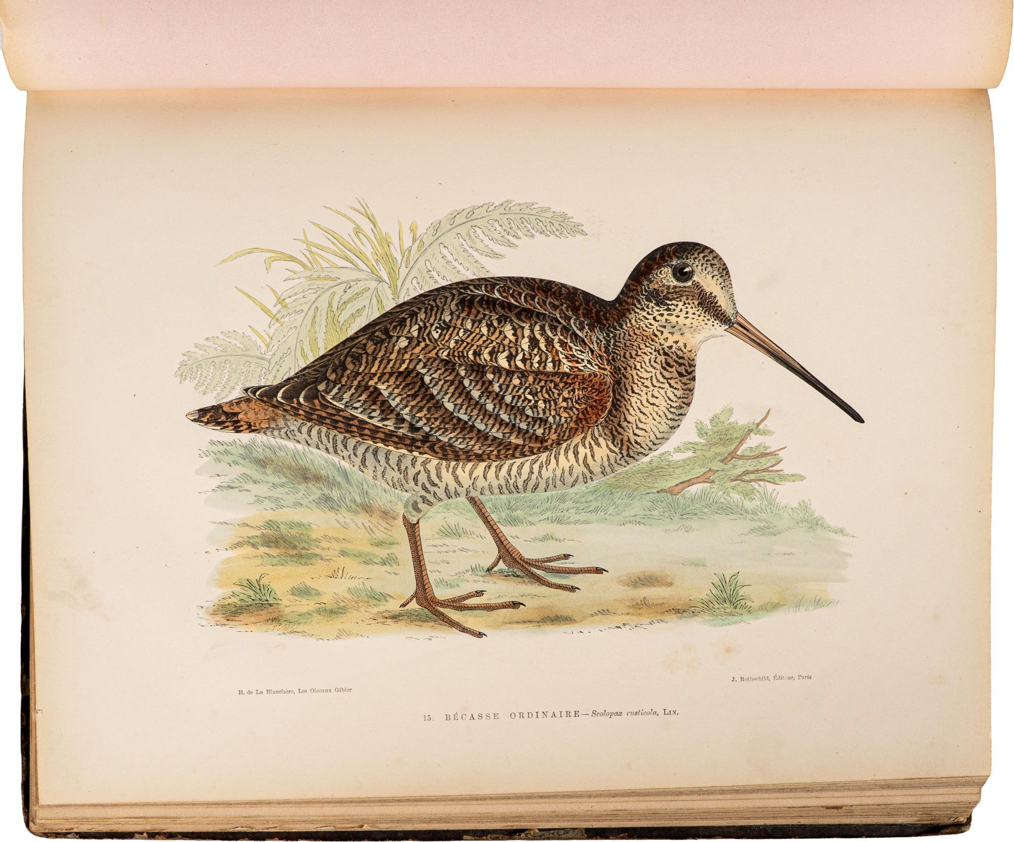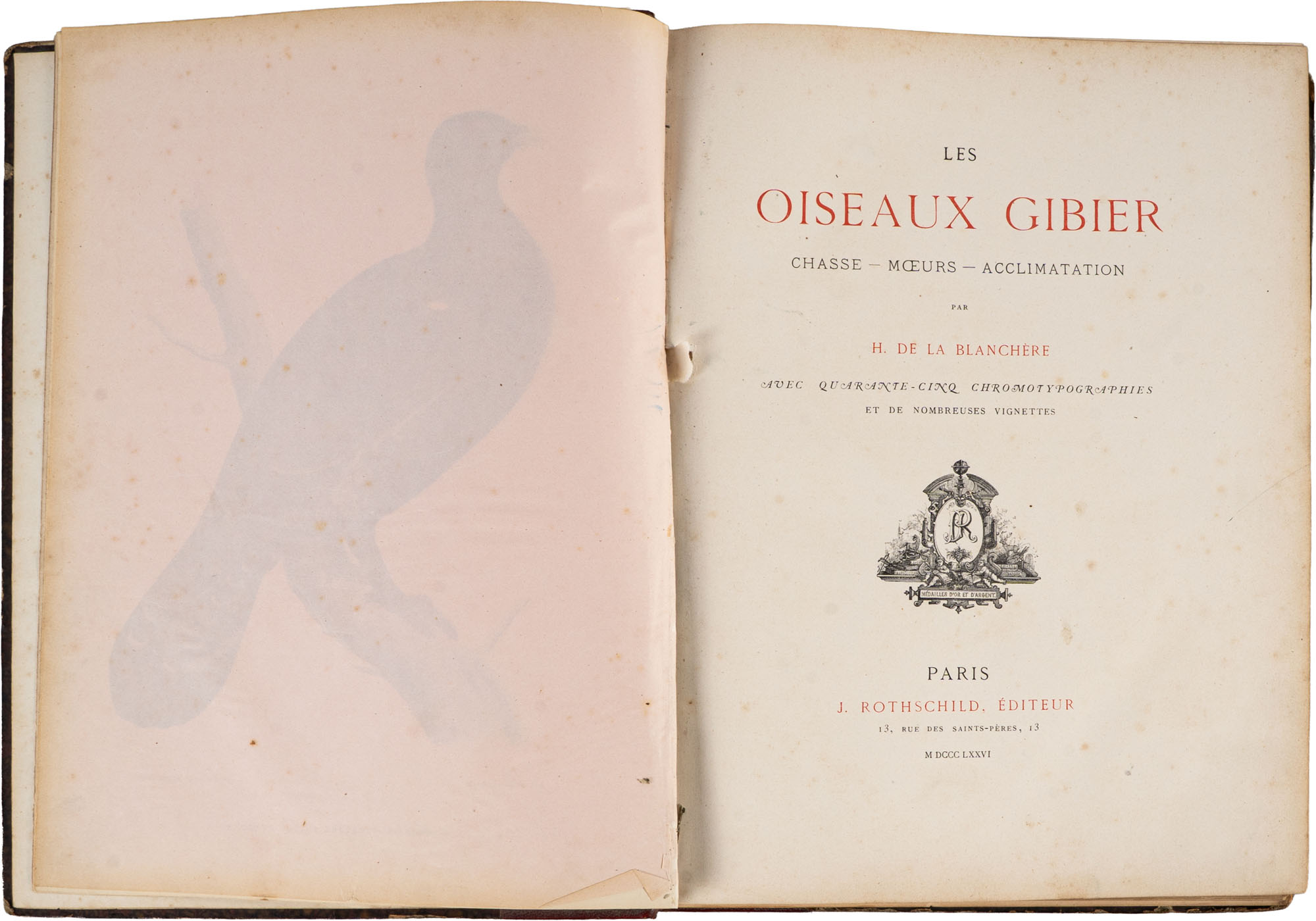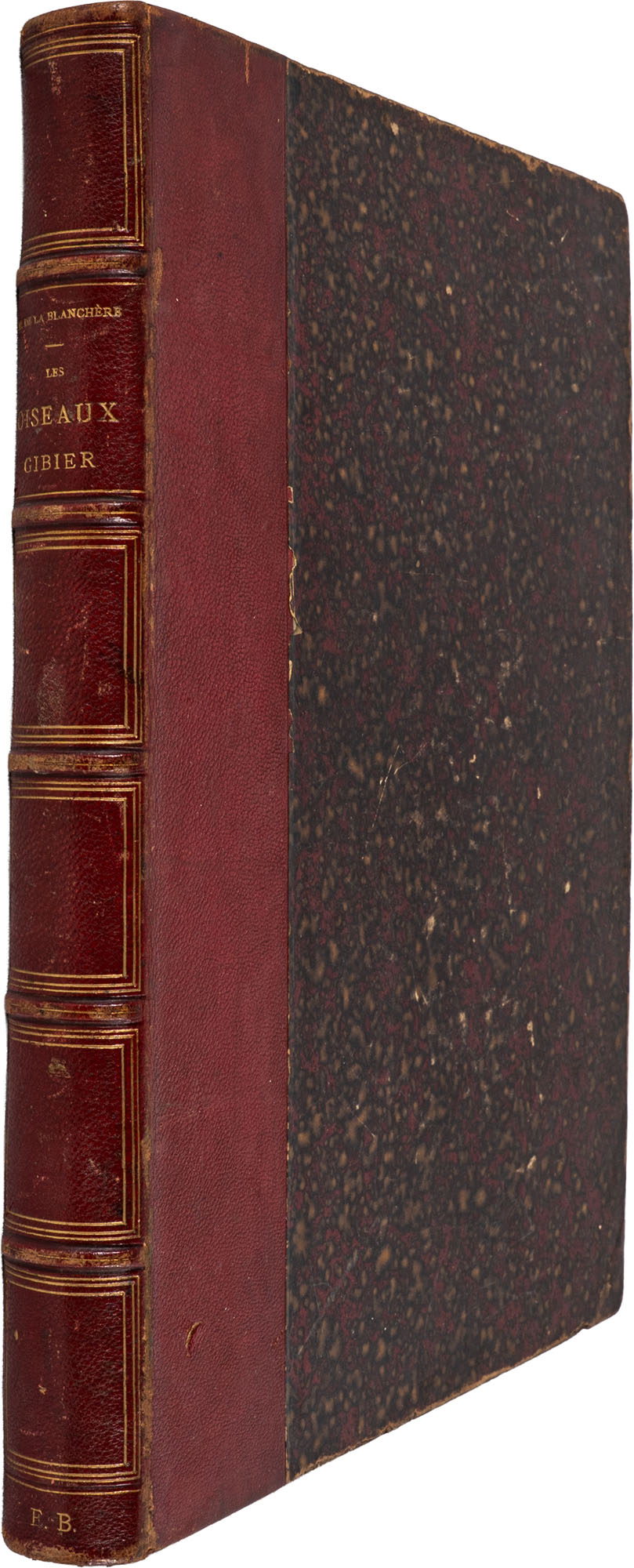 La Blanchère (Henri de) - Les oiseaux gibierParigi, J. Rothschild, 1876Legatura in mezza pelle, autore e titolo in oro al dorsoPp. 140 pagine, con 45 tavole cromolitografiche a colori fuori testoIn folio piccolo (cm. 28,8 x 36,2)Prima Edizione di questo bellissimo raro volume, che, secondo Souhart, sarebbe stato stampato in sole 300 copie (Thiébaud)Qualche screpolatura ai piatti, ma ottimo esemplare