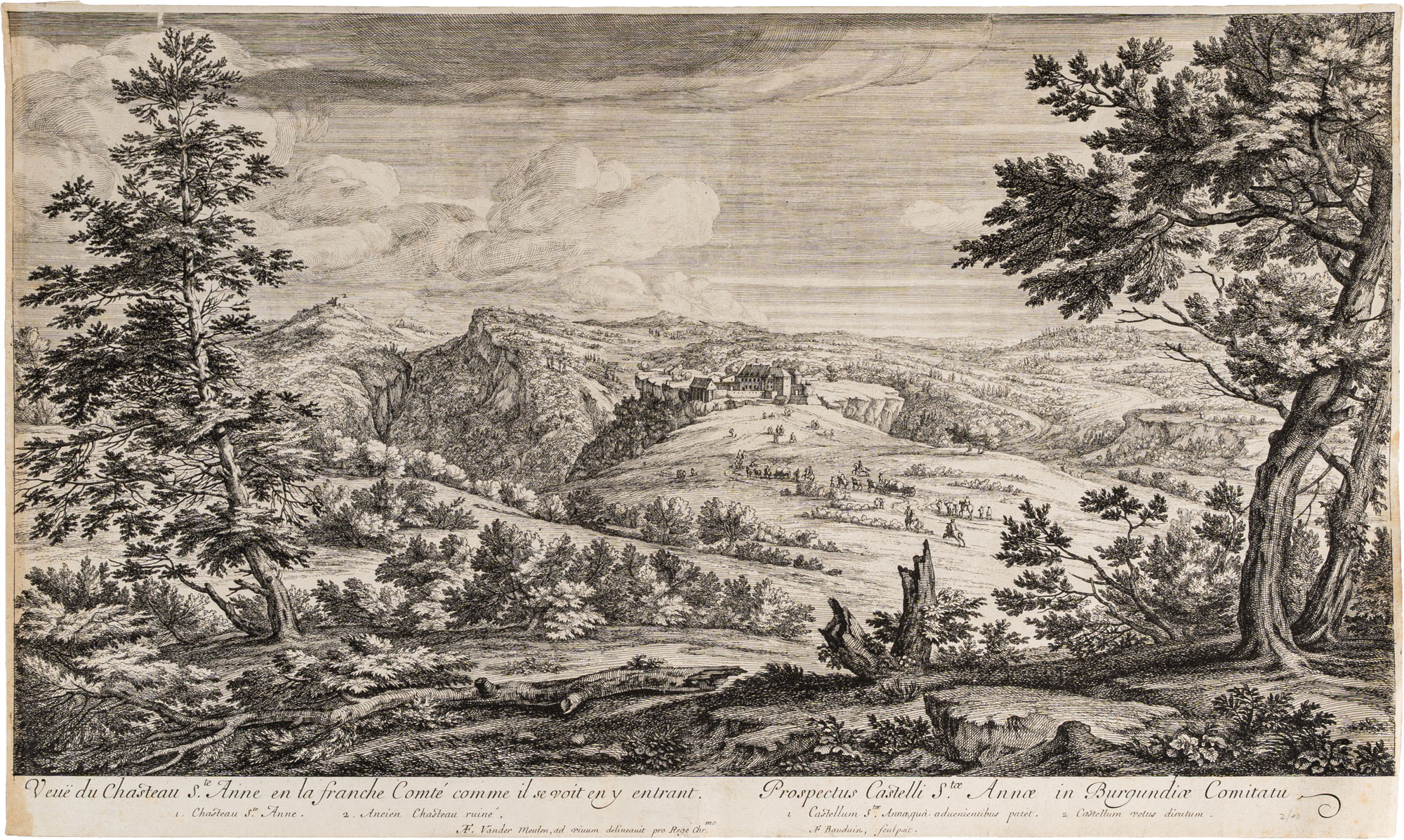 Adriaen Frans Boudewyns (Bruxelles, 1644 - ivi, 1711) da Adam François van der Meulen (Bruxelles, 1632 - Parigi, 1690) - Veduta del Castello di Sainte-AnneAcquaforteCm. 41,5 x 69,3