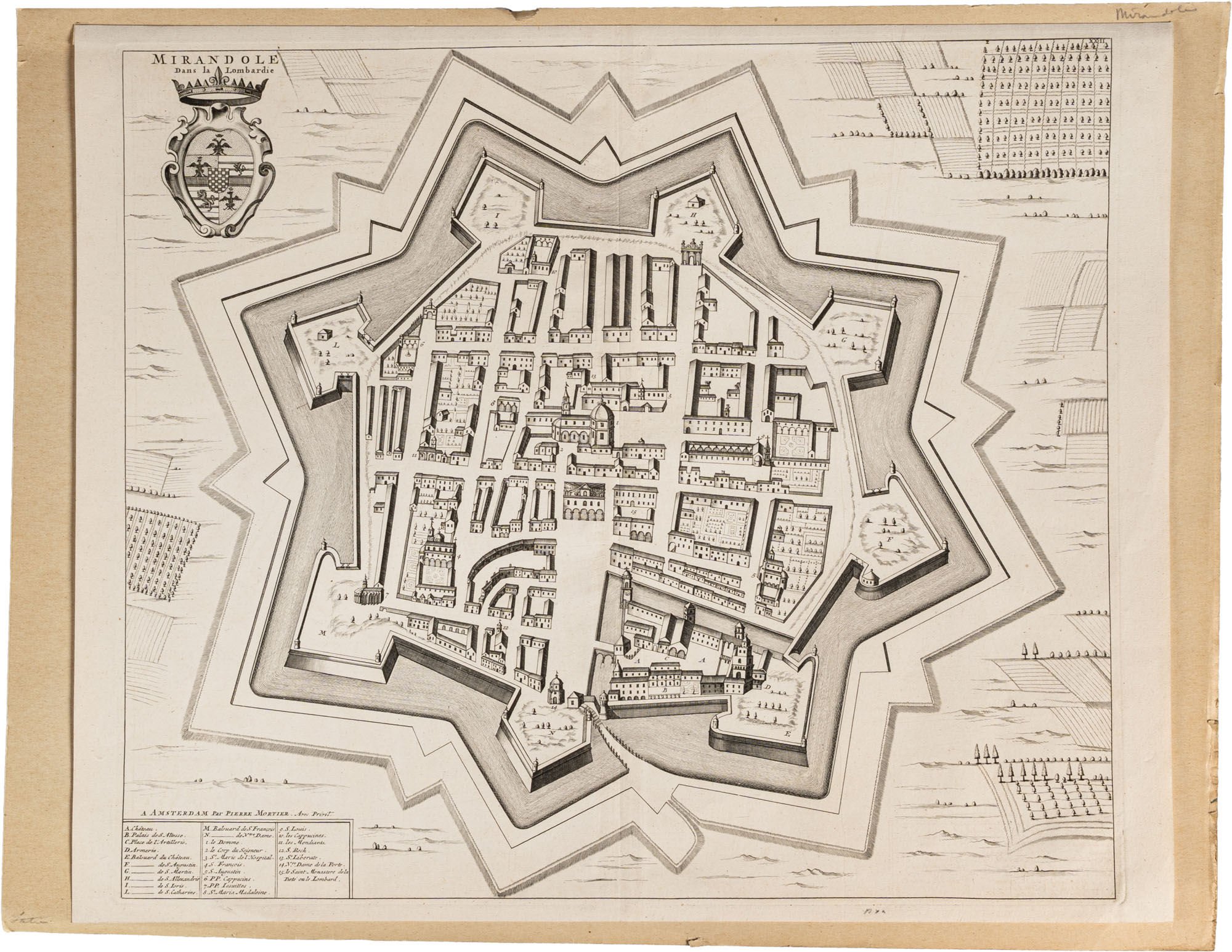 Johannes Blaeu (Alkmaar, 1596 - Amsterdam, 1673), Pierre Mortier (Leida, 1661 - Amsterdam, 1711) - Mirandole Dans la LombardieBulinoCm. 45,5 x 53 (lastra)Cm. 47,7 x 58 (foglio)Tavola da 'Nouveau theatre d'Italie ou description exacte de ses villes, palais, eglises'