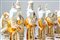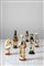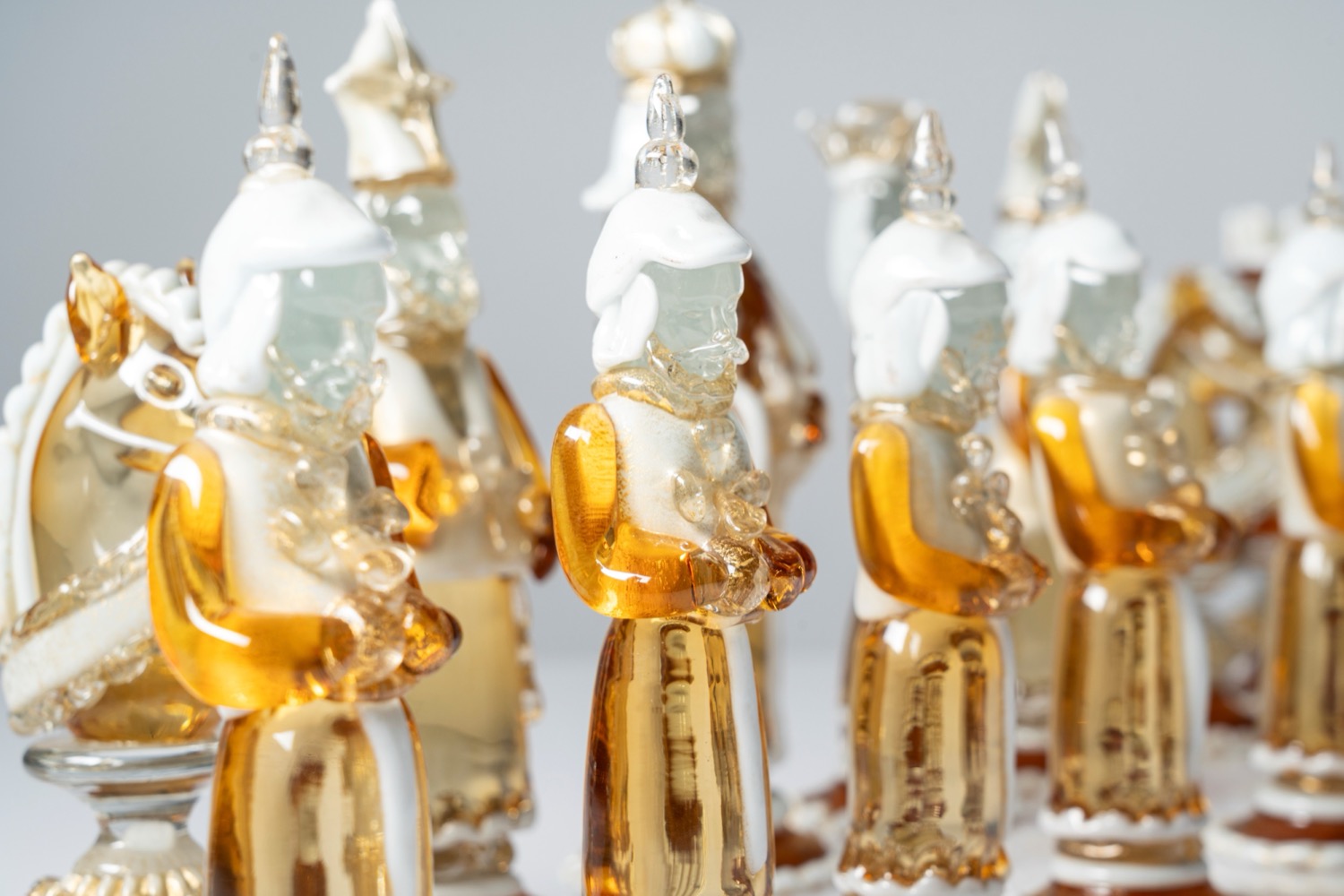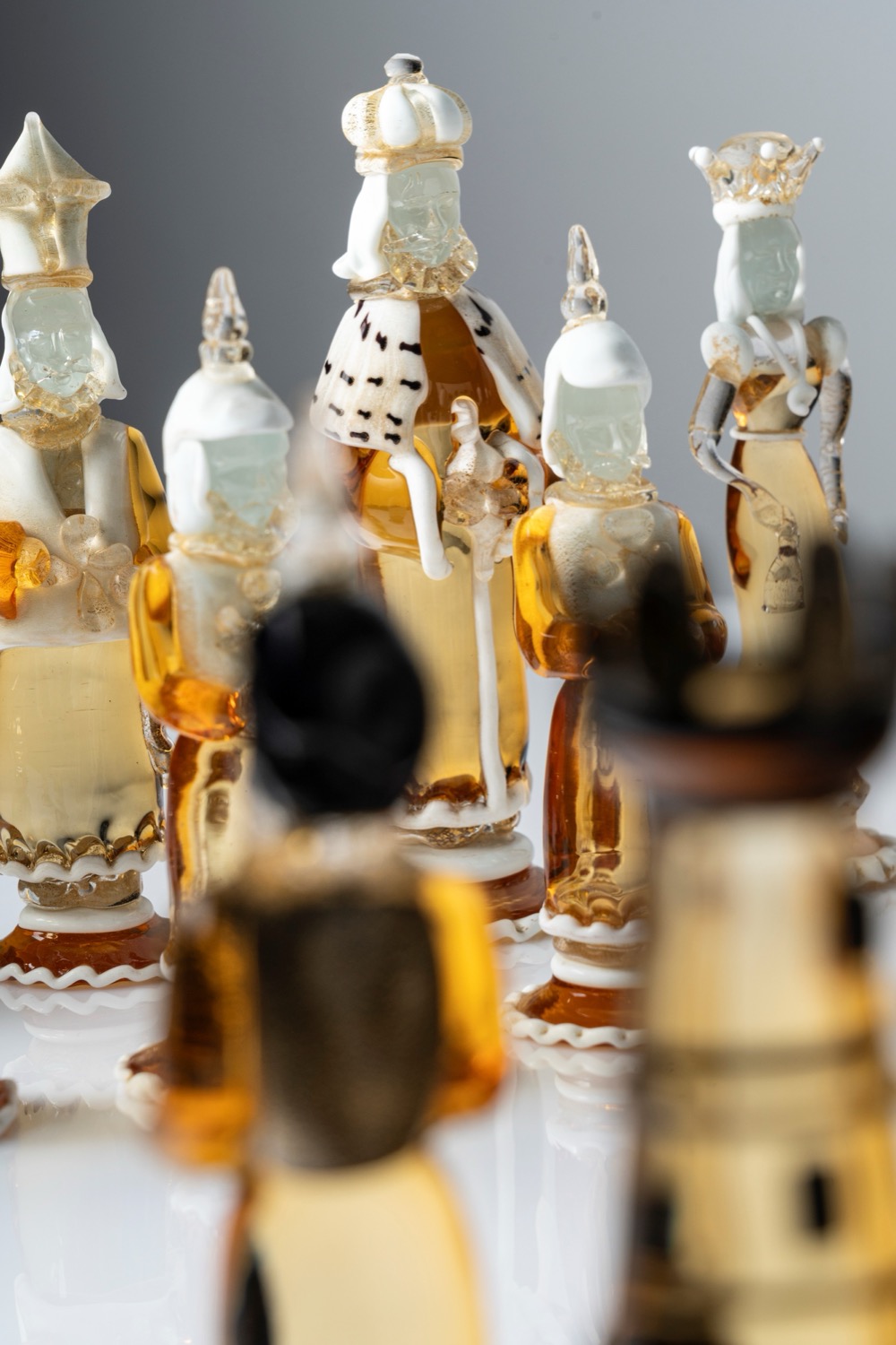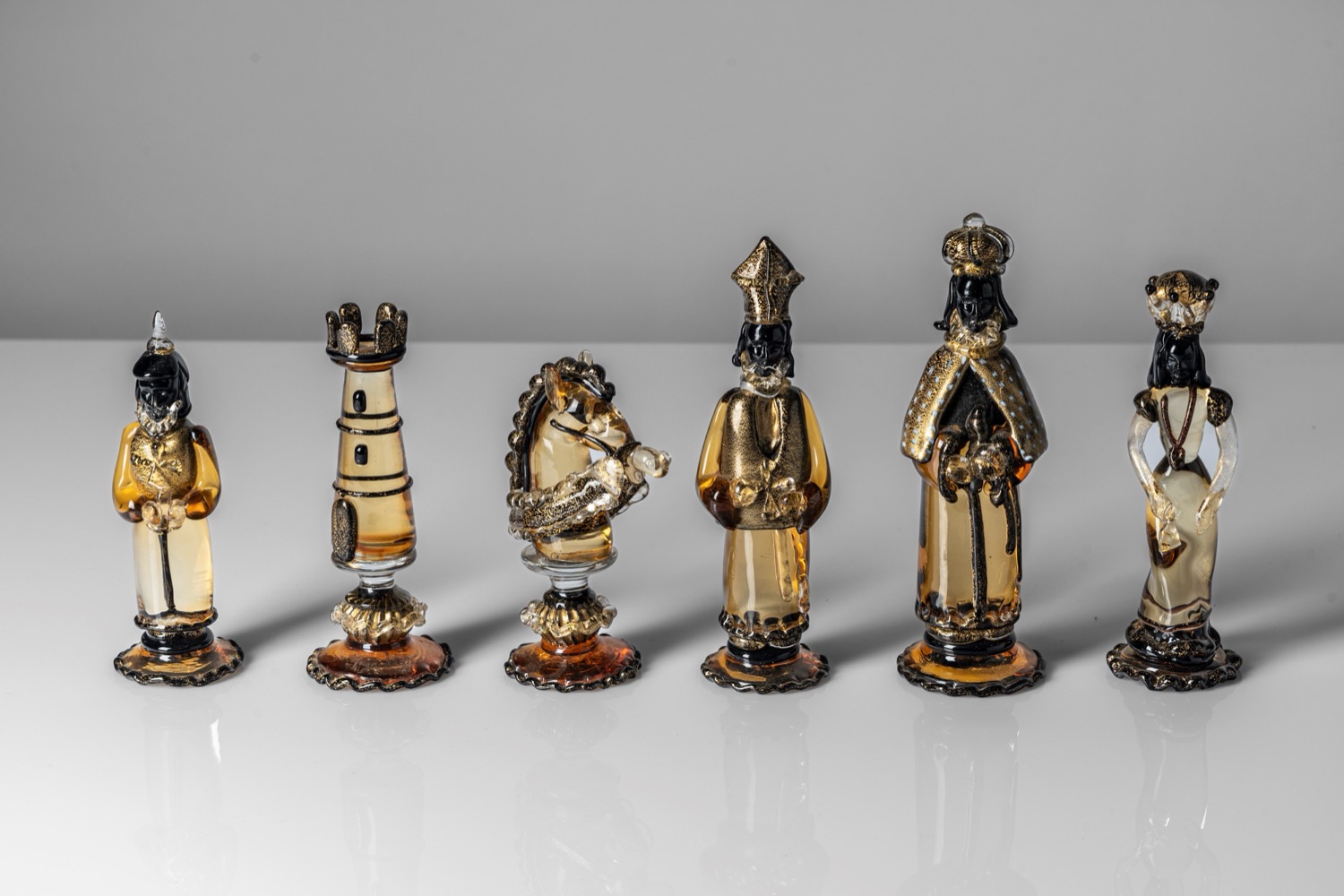 Raro set di scacchi composto da 32 elementi in vetro massiccio color ambra, finiture in pasta di vetro bianca o nera e decoro a foglia oro