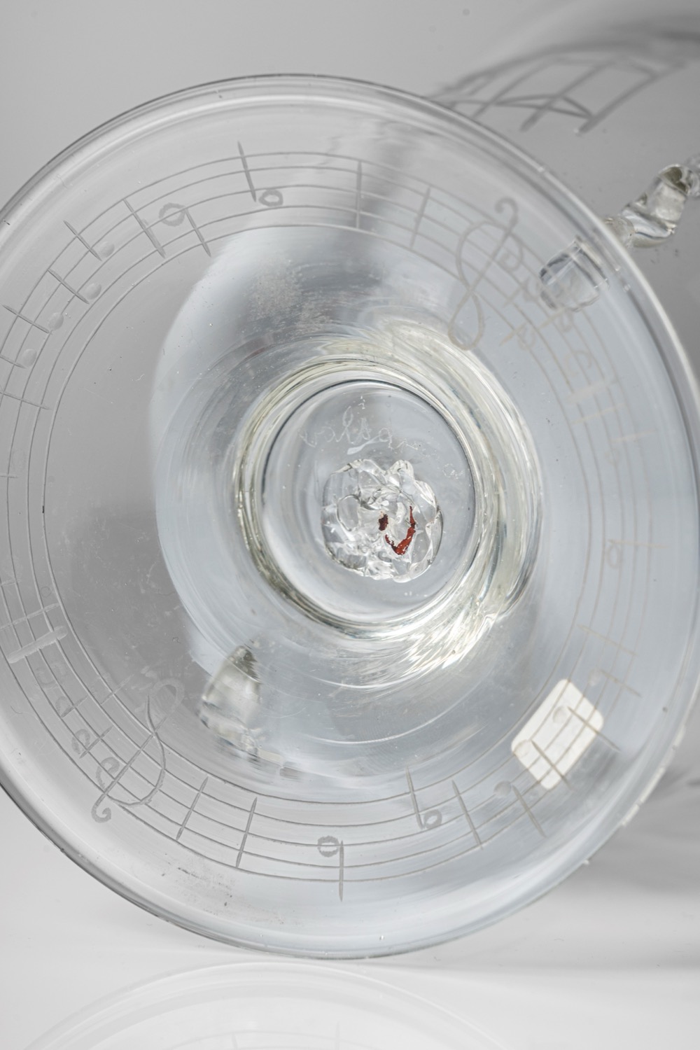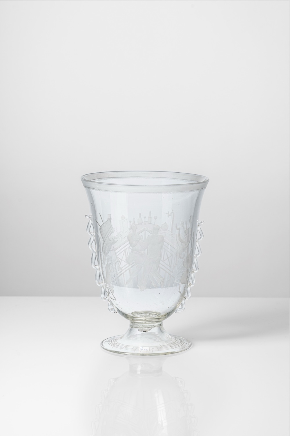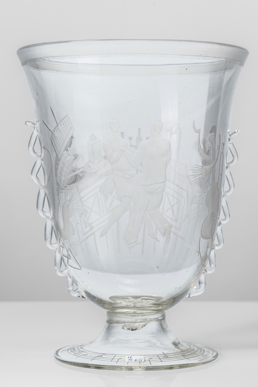 Vaso in vetro incolore con anse laterali applicate e decoro ad incisione a bulino, decoro su disegno di Guido Balsamo Stella
