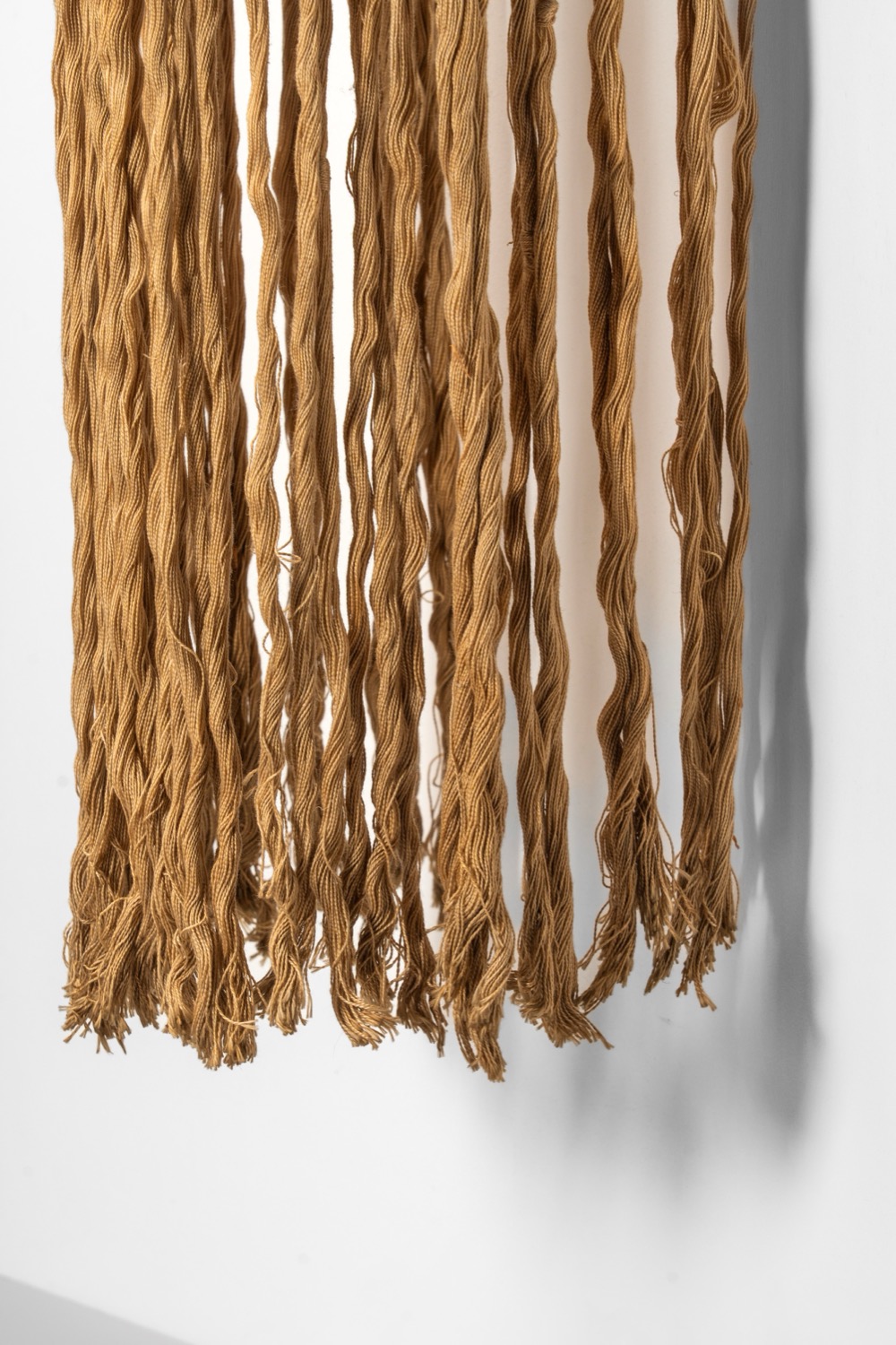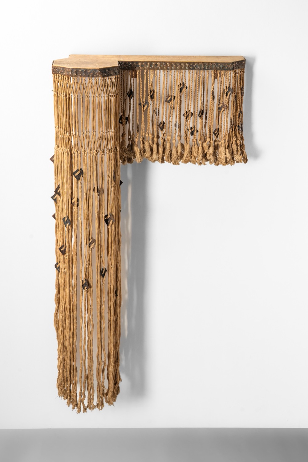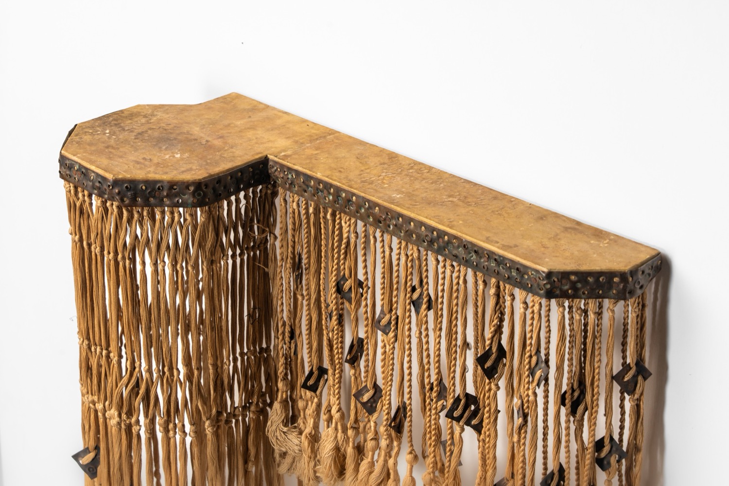 Console sospesa con piano rivestito in pergamena, decorazione in rame sbalzato e frange in passamaneria