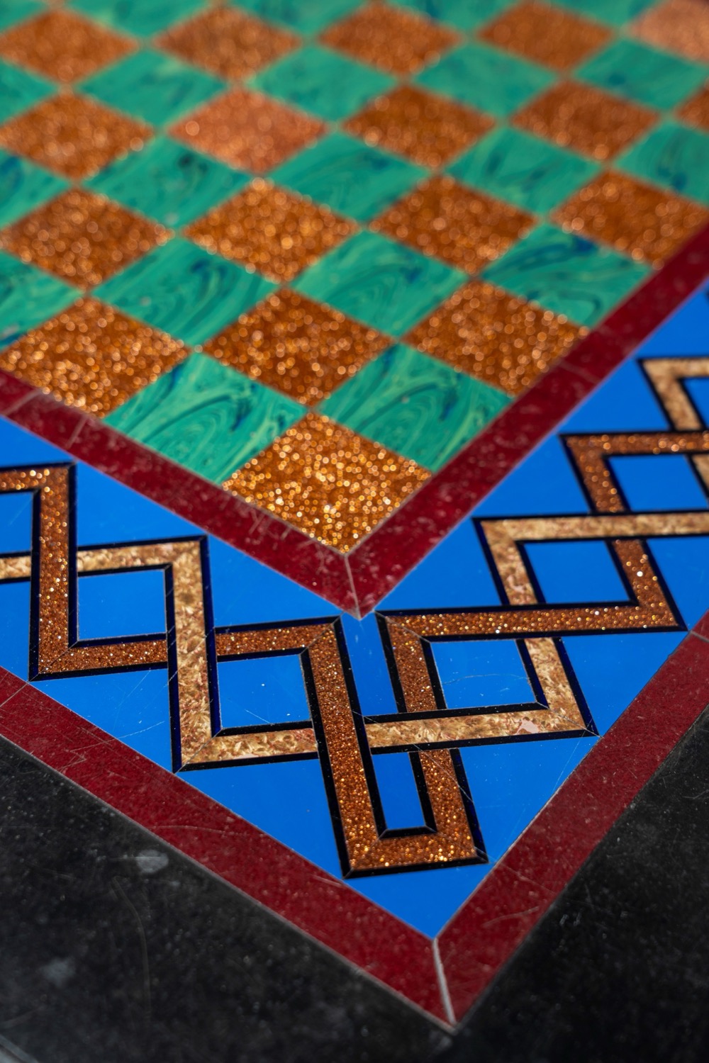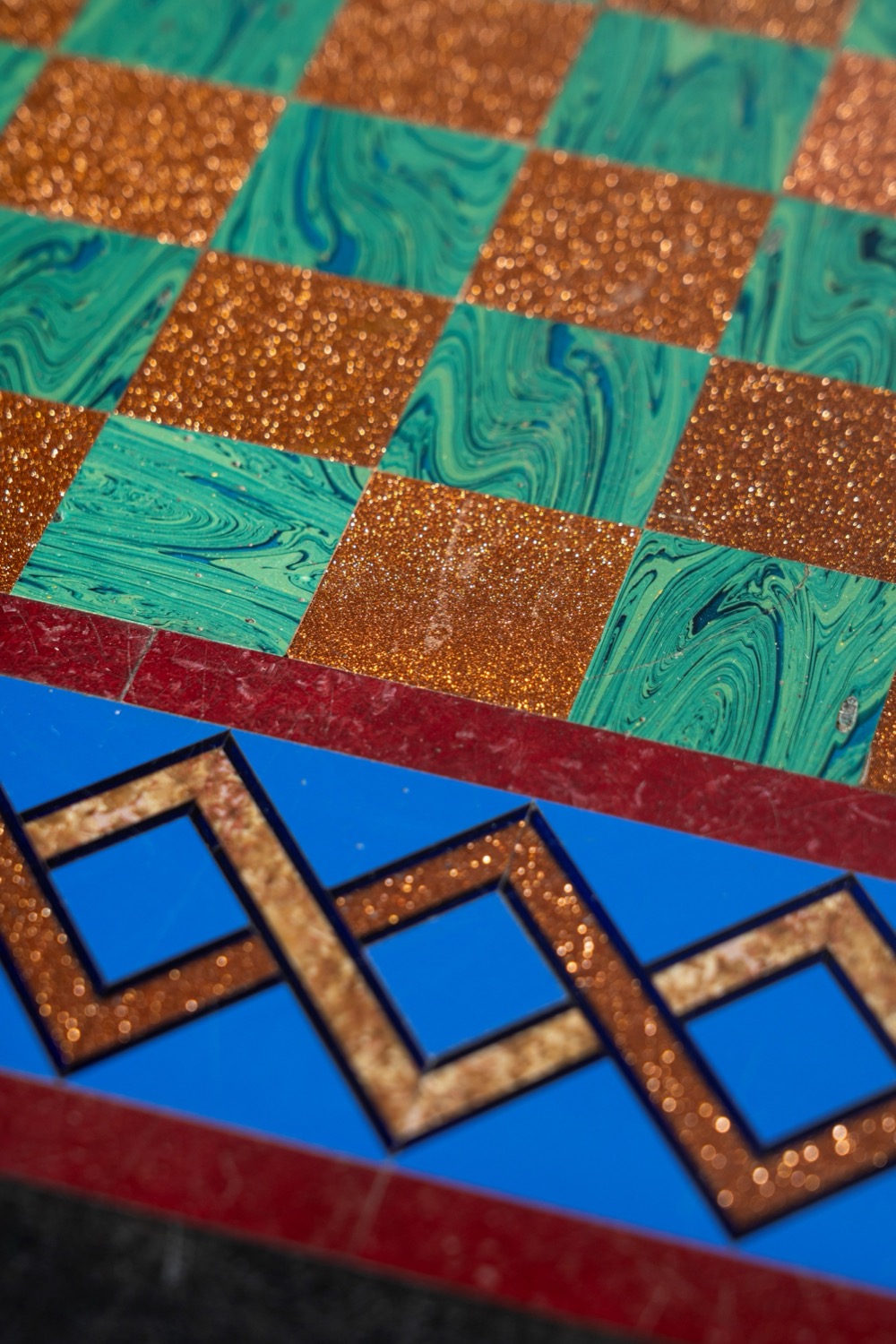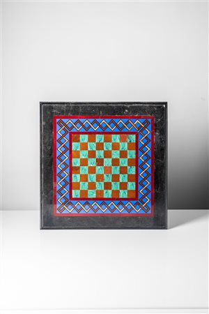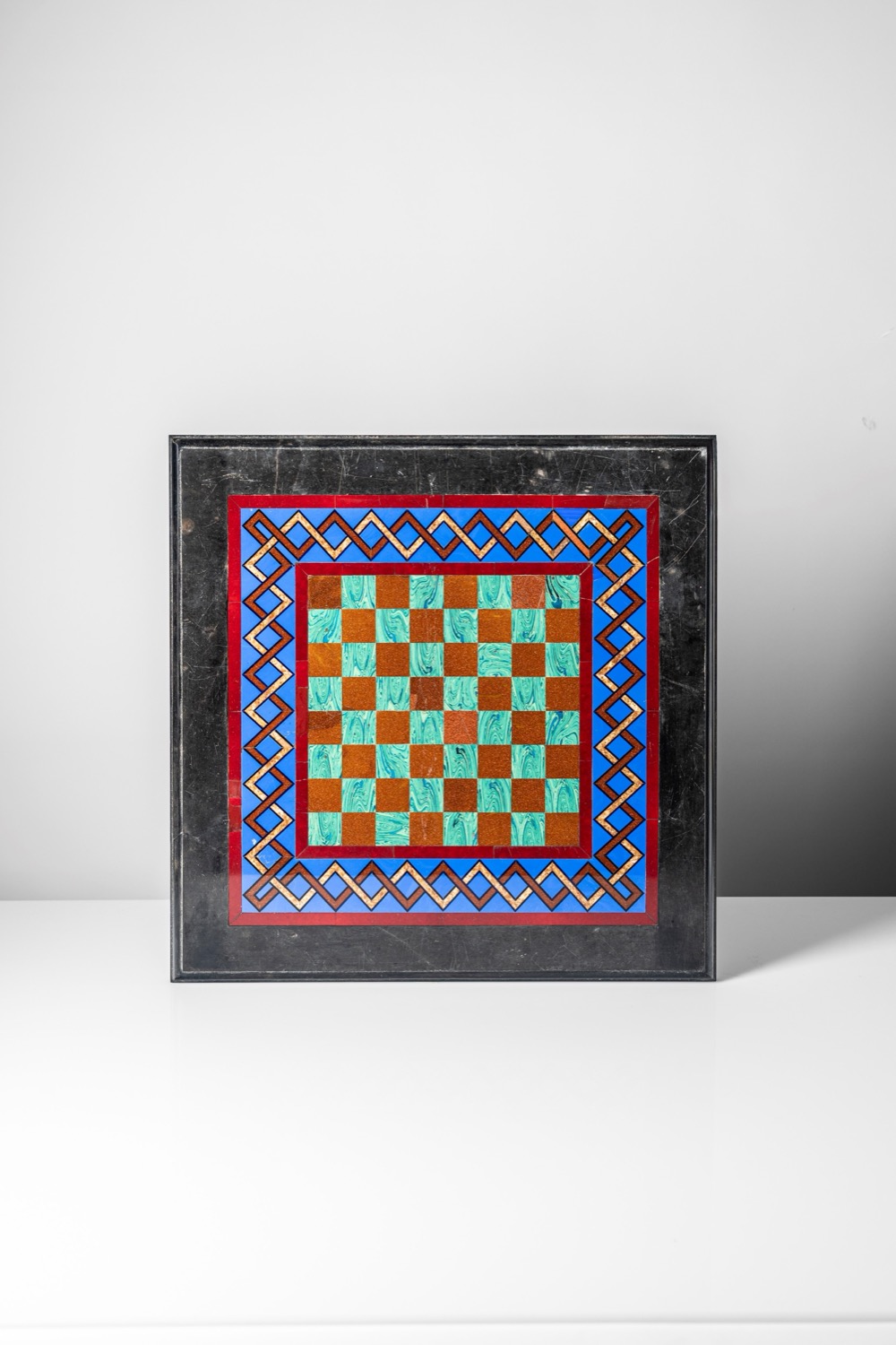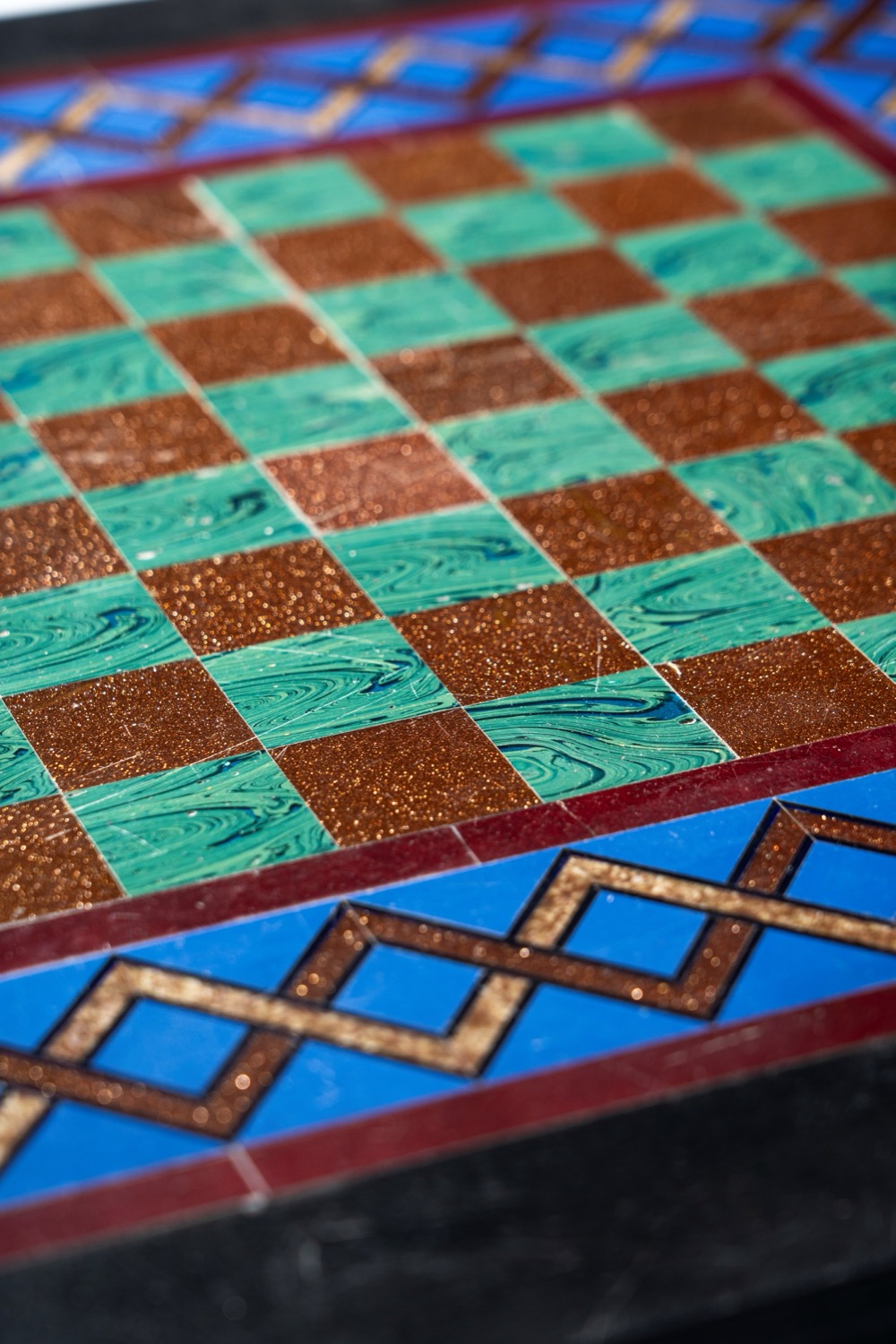 Rara scacchiera su base di ardesia con intarsi in pasta vitrea ad imitazione pietra dura, malachite, marmo, corniola, lapis ed avventurina