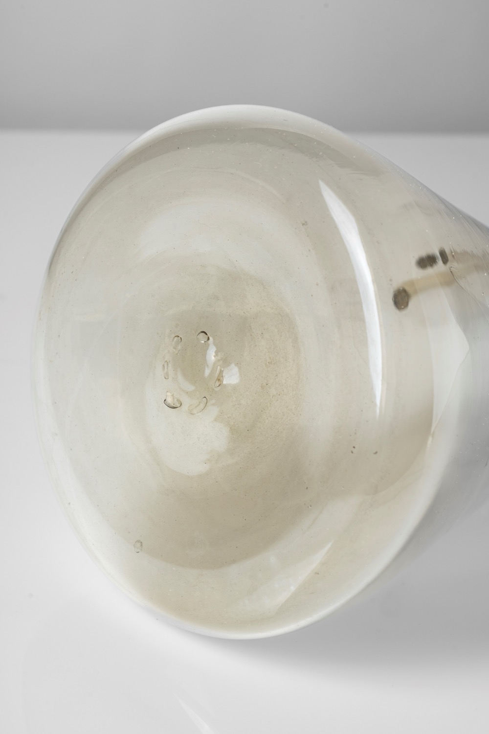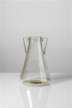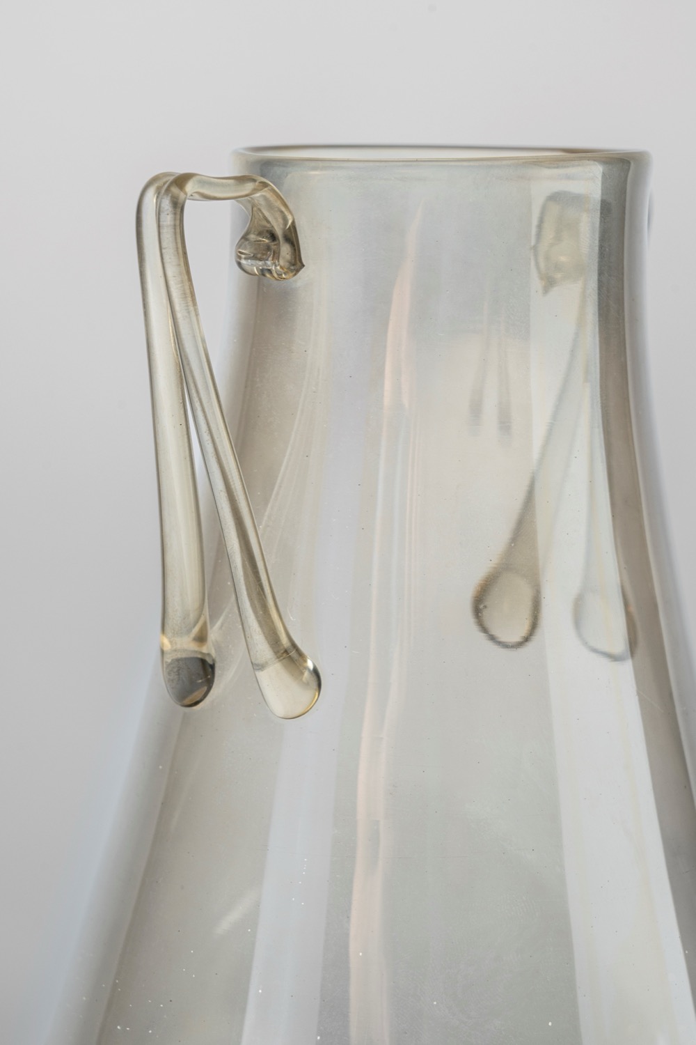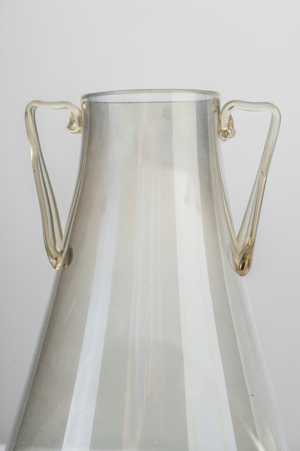 Vaso in vetro soffiato 'pagliesco' leggermente iridato con doppie anse applicate