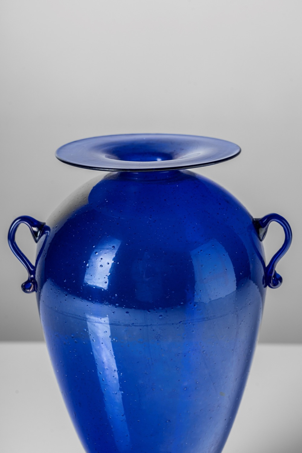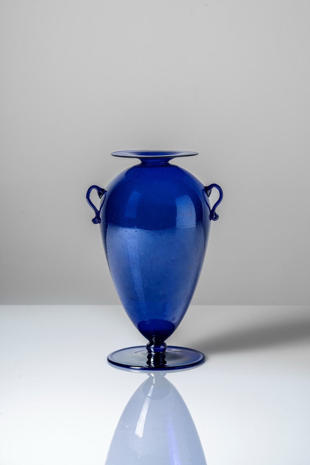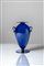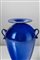 Vaso in vetro soffiato blu cobalto con piede ed anse applicate