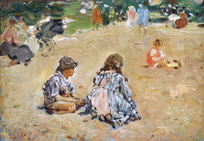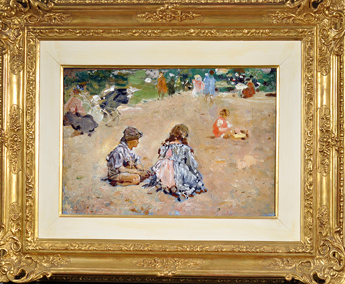 Ragione Raffaele (Napoli 1851 - 1925) Bimbi al Parco Monceau olio su cartone, cm 28x40 firmato in basso a destra: R. Ragione Provenienza: Coll. privata, Bologna Bibliografia: D. Di Giacomo - P.L. Di Giacomo, Raffaele Ragione impressionista napoletano, Ianieri Ed. Pescara 2007, tav. LXXVI p. 128