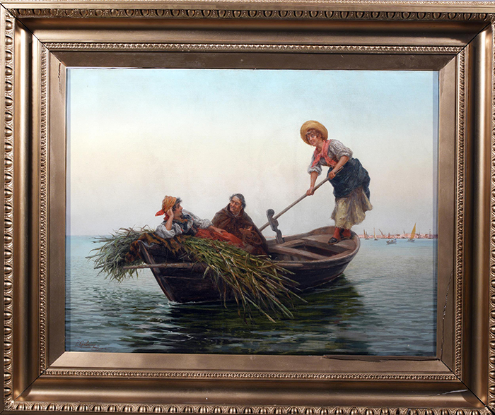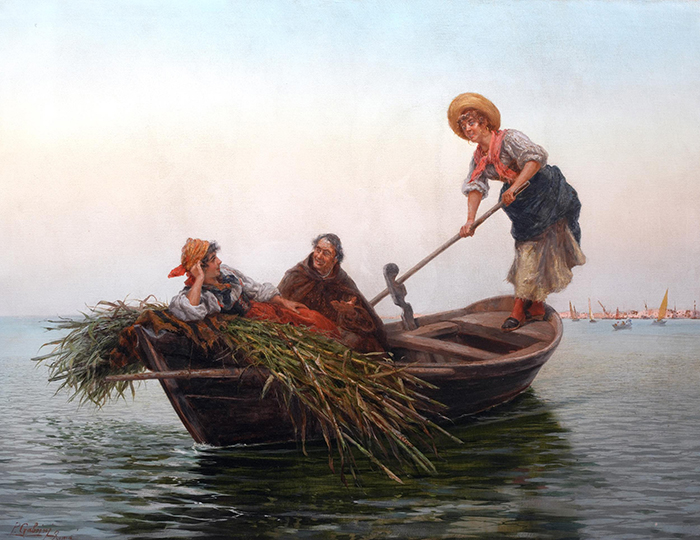 Gabrini Pietro (Roma 1856-1926) Sulle lagune di Venezia olio su tela, cm 76x100 firmato e iscritto in basso a sinistra: P. Gabrini Roma