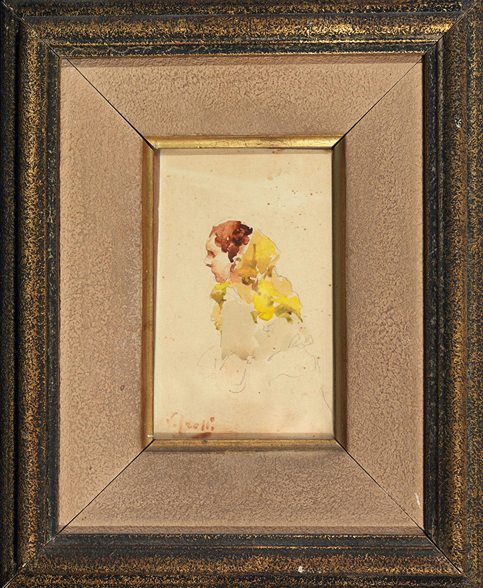 Irolli Vincenzo (Napoli 1860 - 1949) Mezza figura acquerello su carta, cm 14,5x9,5 firmato in basso a sinistra: V. Irolli