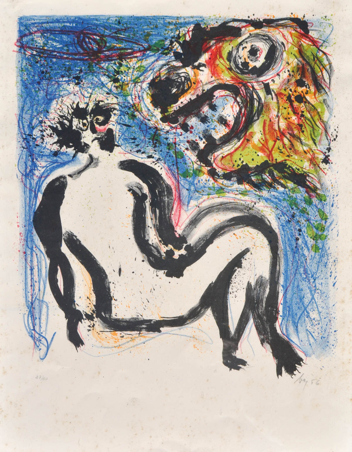 Enrico Baj (Mailand/Milano 1924 - Vergiate 2003) Uomo assalito dal mostro, 1956;Litografia a col. su carta, 49,5 x 38,5 cm,