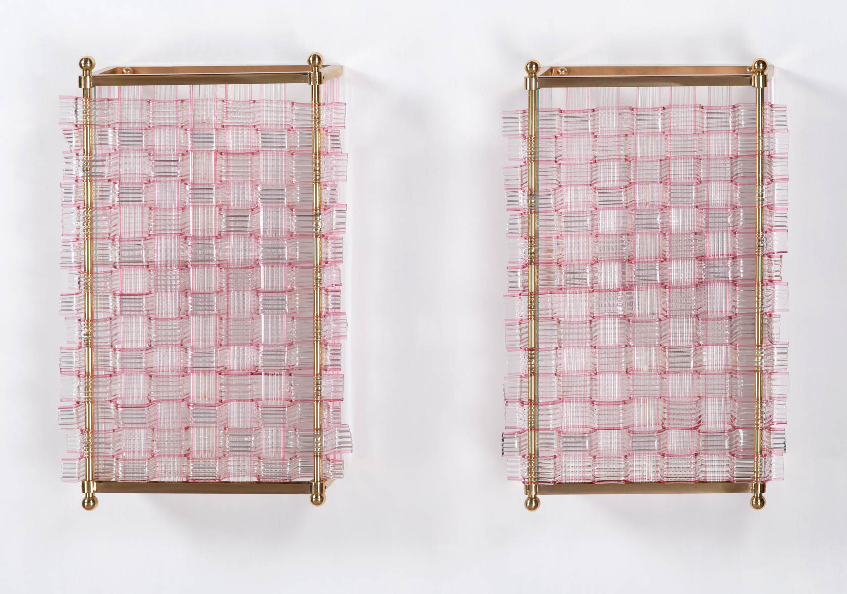 Flavio Poli Coppia di applique Hotel Bristol Merano, 1953/54;Listelli lineari e ondulati in vetro zigrinato trasparenti color rubino, struttura in ottone, H. 51 x 33 x 10,5 cm. Elementi provenienti da un grande lampadario realizzato dalla Seguso Vetri d’arte Murano per l’Hotel Bristol