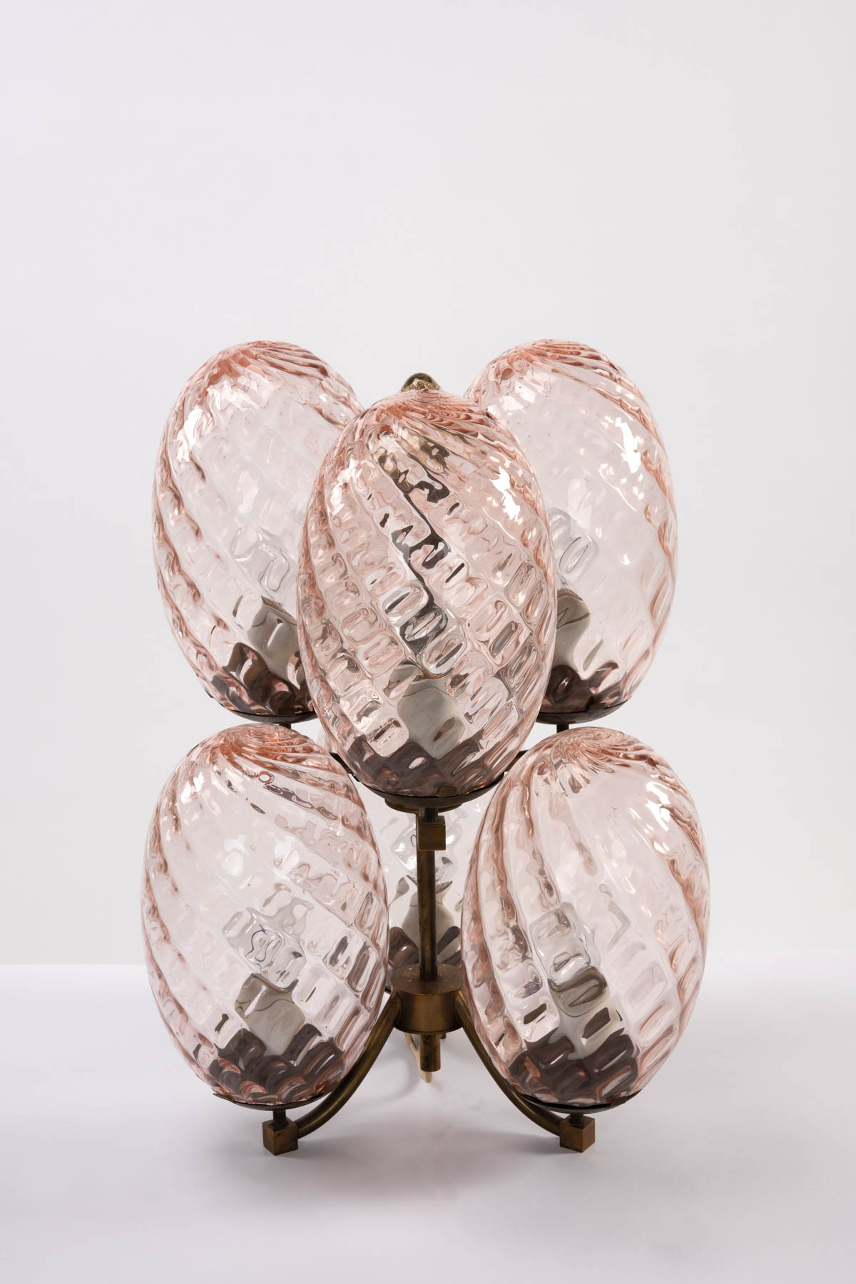 Manufaktur Murano/Manifattura Murano Lampada da tavolo, Anni ‘50/60;5 Diffusori in vetro rosa con fori, struttura in ottone, h. 60 cm, larghezza 45 cm. Parte di un lampadario formato da più elementi
