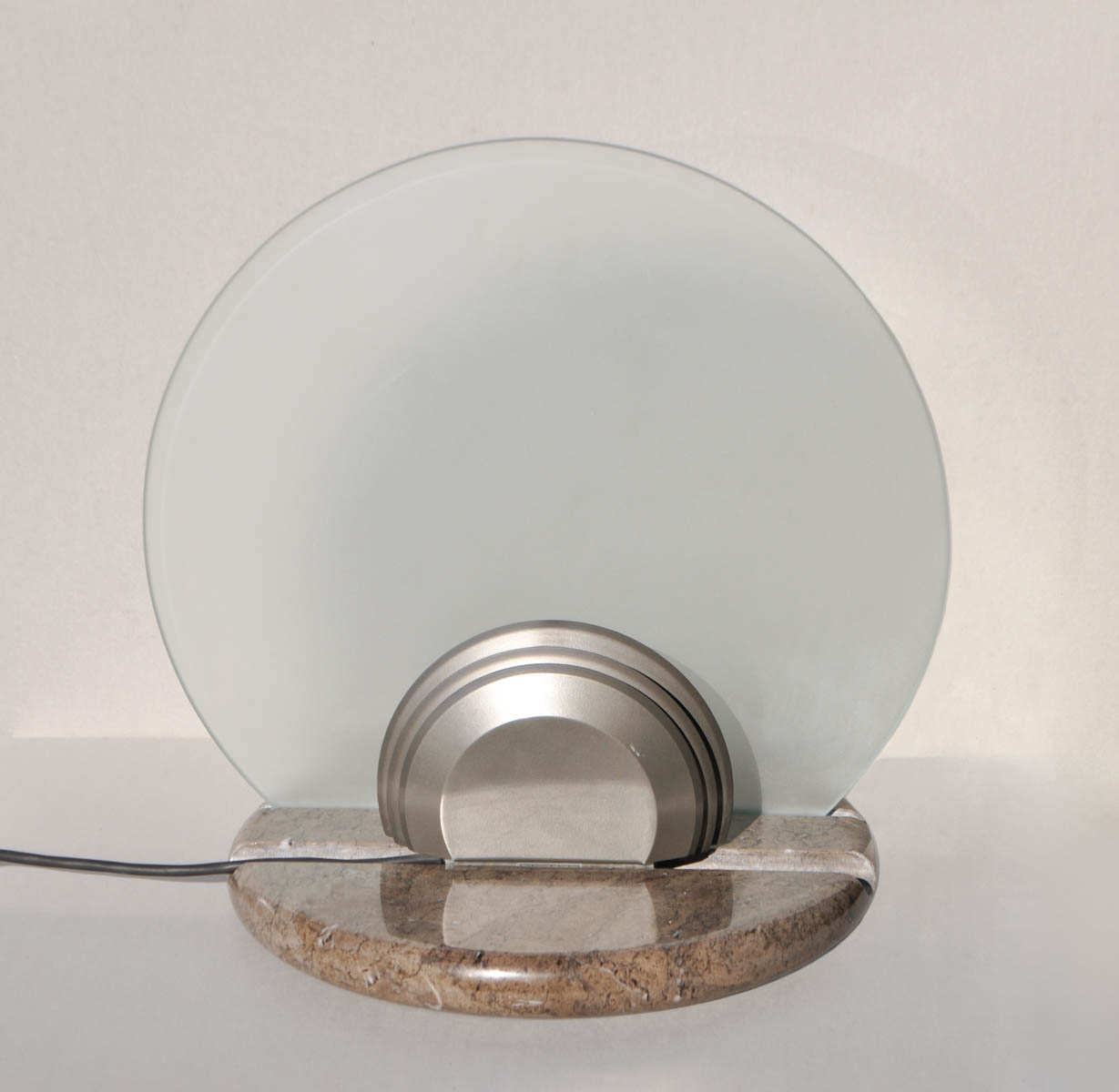 Bruno Gecchelin Lampada da tavolo Skipper Gong, Anni ‘80;Base in marmo, metallo, vetro opaco, h.42 x 47 cm