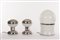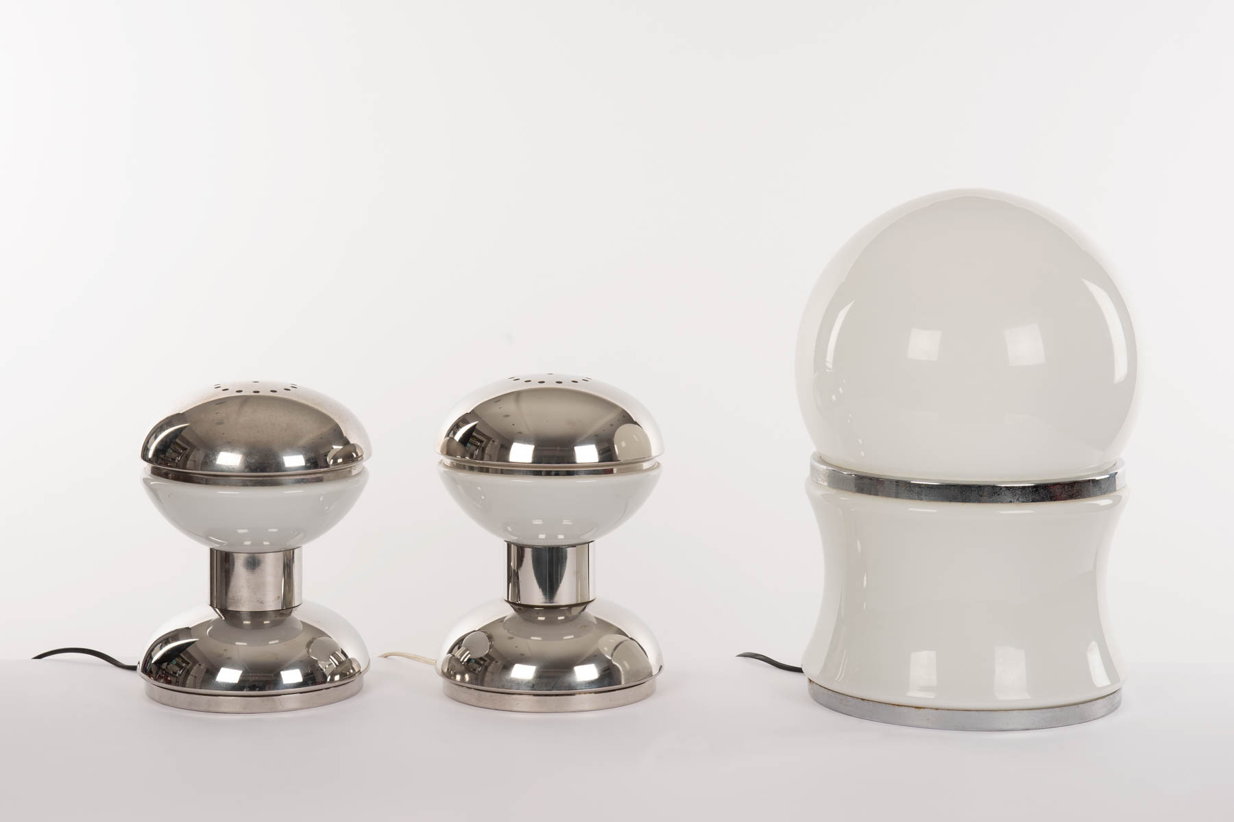 Goffredo Reggiani Coppia lampade da tavolo modello Diablo, Anni ‘70;Metallo cromato e vetro lattimo, h. 26 x 20 cm, alla base etichetta adesiva "Made Reggiani"
