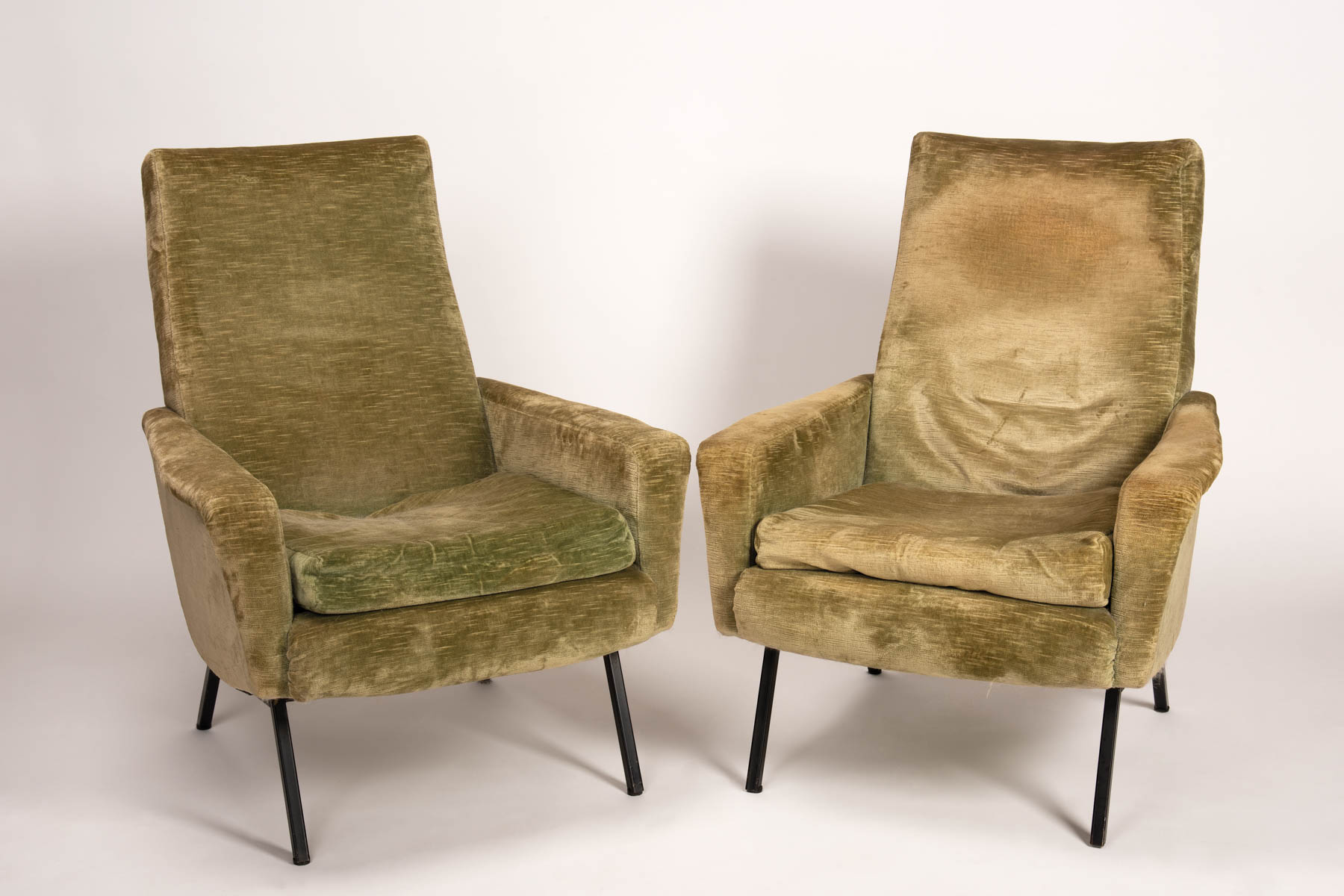 Italienische Manufaktur/Manifattura italiana Coppia poltrone, Anni ‘50;Struttura in ferro, rivestimento in velluto da rifare, h. 95 x 75 x 73 cm
