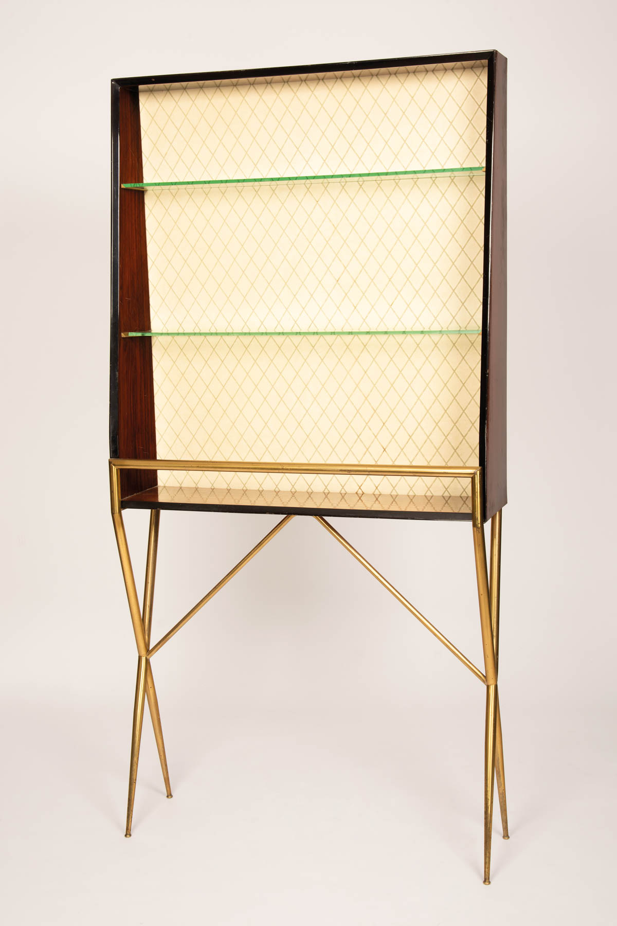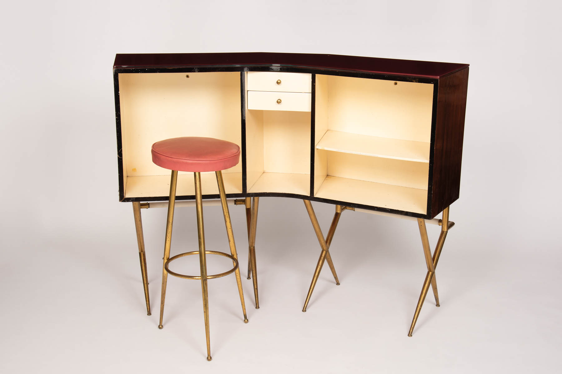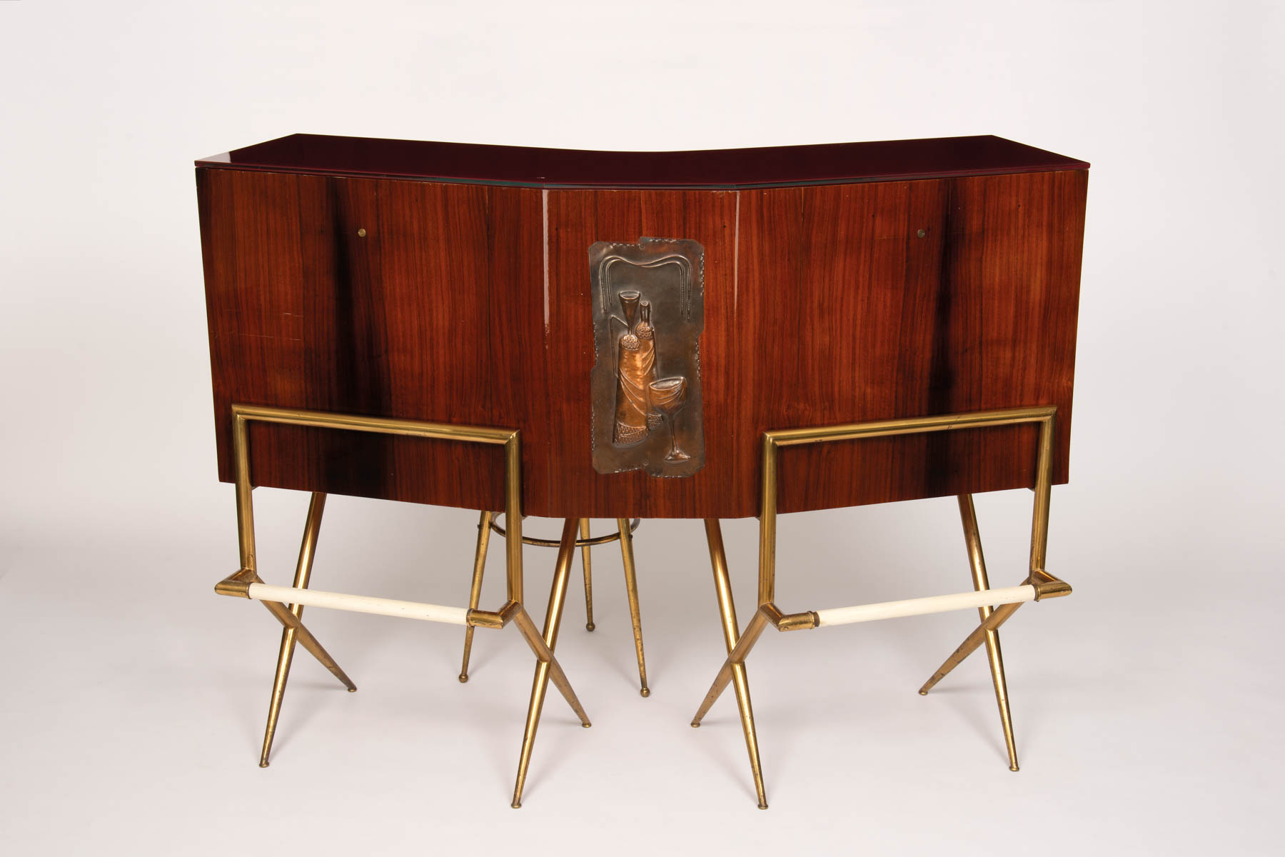 Italienische Manufkatur/Manifattura italiana Mobile bar con vetrinetta e sgabello, anni ‘50;Struttura in ottone, legno mogano impialacciato e laccato, vetro di copertura, placca in rame applicata al fronte, h. 98 cm, lunghezza