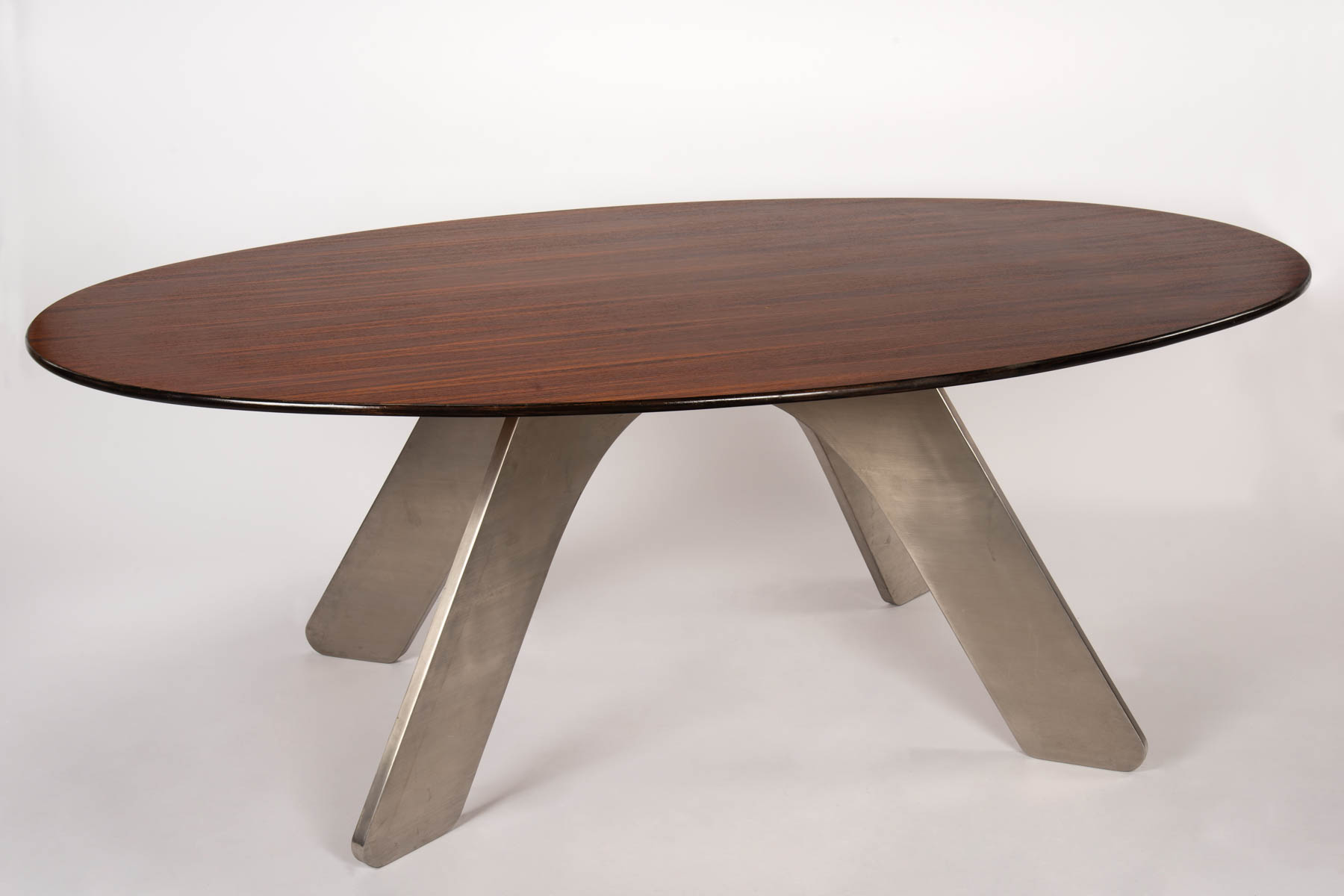 Italienische Manufaktur/Manifattura italiana Tavolo ovale, Anni ‘70;Struttura in acciaio, piano in legno, lievi scheggiature del ripiano, h 74 x 192 x 131 cm