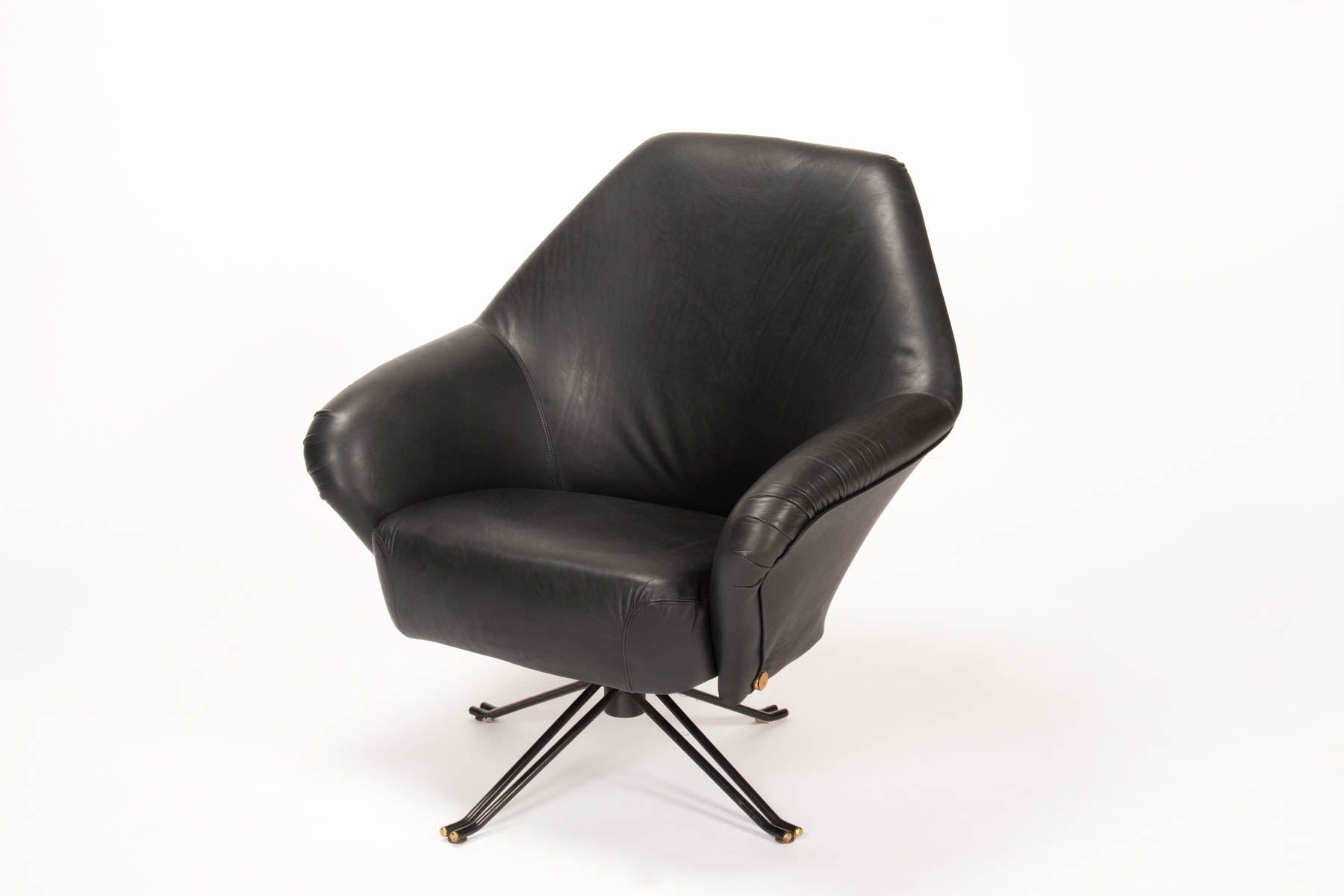 Osvaldo Borsani Poltrona P32, Anni ‘50;Pelle nera e struttura in metallo, h. 88 x 81 x 48 cm, produzione Tecno, etichetta alla base e marchio Tecno