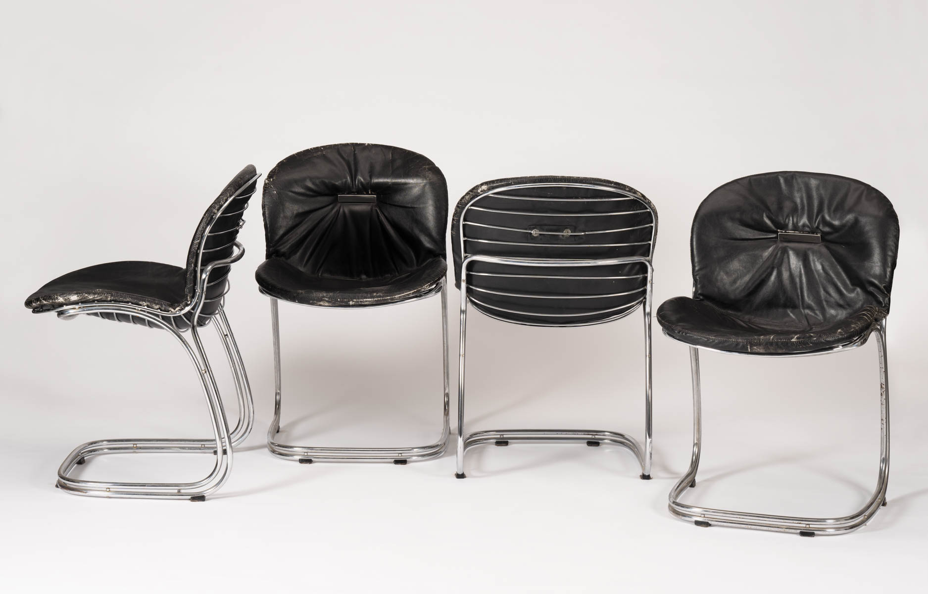 Gastone Rinaldi 4 sedie modello Sabrina, Anni '70;Struttura in metallo cromato e rivestimenti in