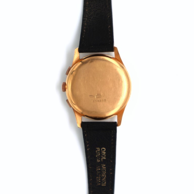 Modello cronografo in oro vintage, seriale 909312, movimento meccanico a carica manuale, calibro Landeron L248.