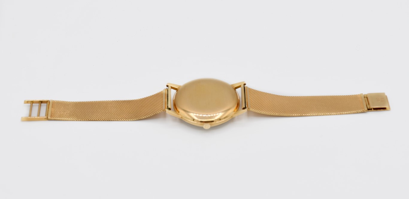 Carica manuale con cassa in oro non marcata con logo brand, fondo a scatto, bracciale tessuto in oro non marcato con logo del brand, vetro plexy, quadrante silver con indici incisi, movimento calibro Zenith 126